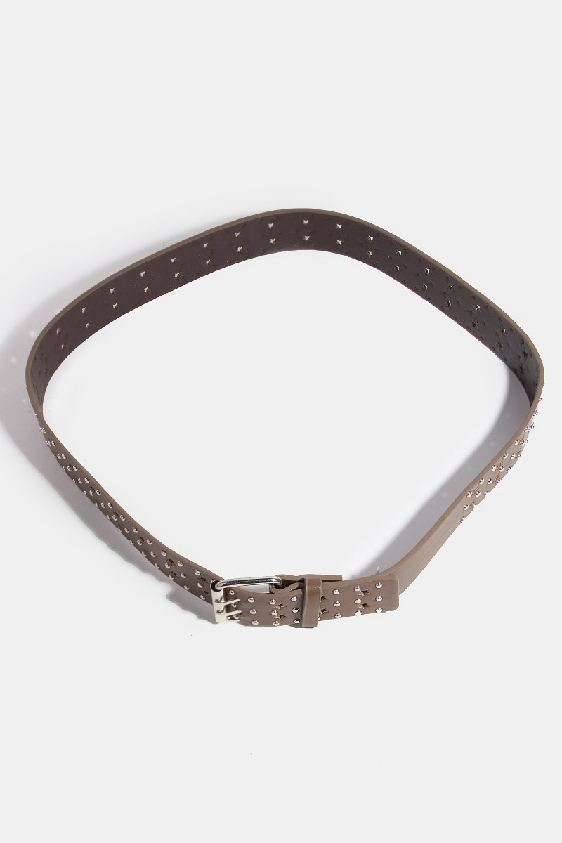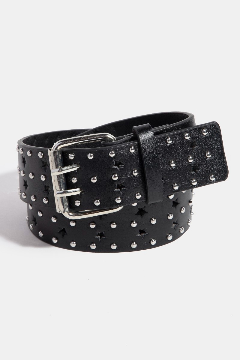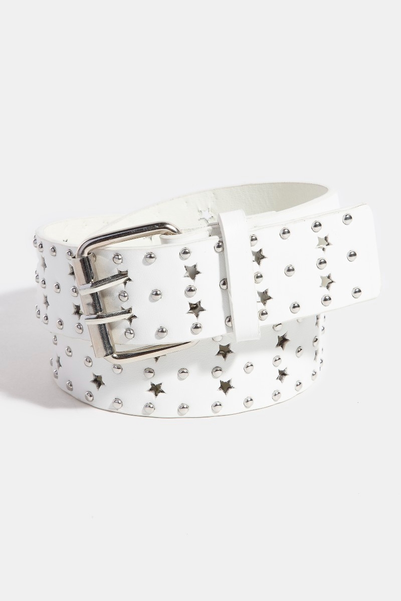 - This faux leather belt showcases a unique star punched studded style. Experience a subtle blend of modernity and classic charm as this faux leather belt effortlessly adorns your ensemble.