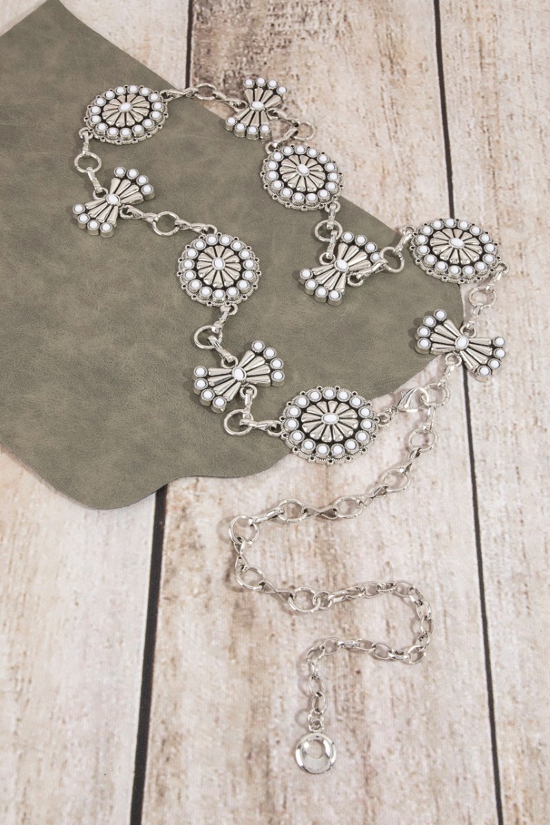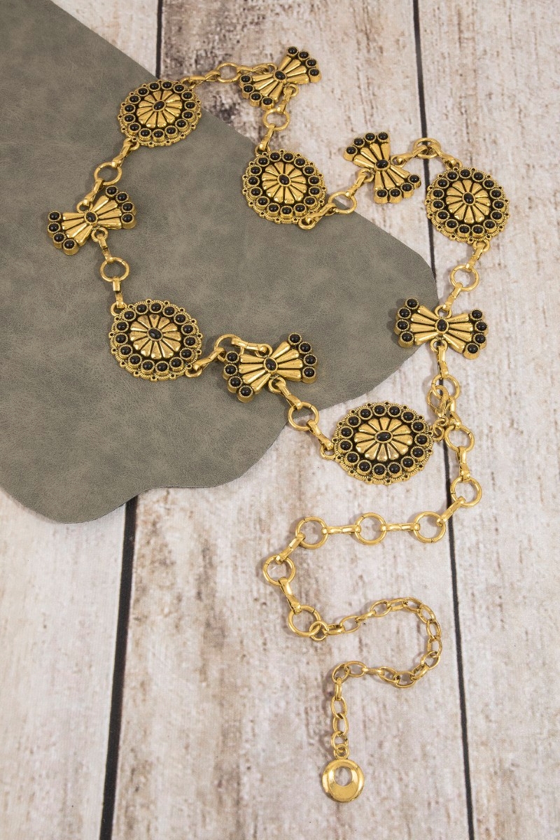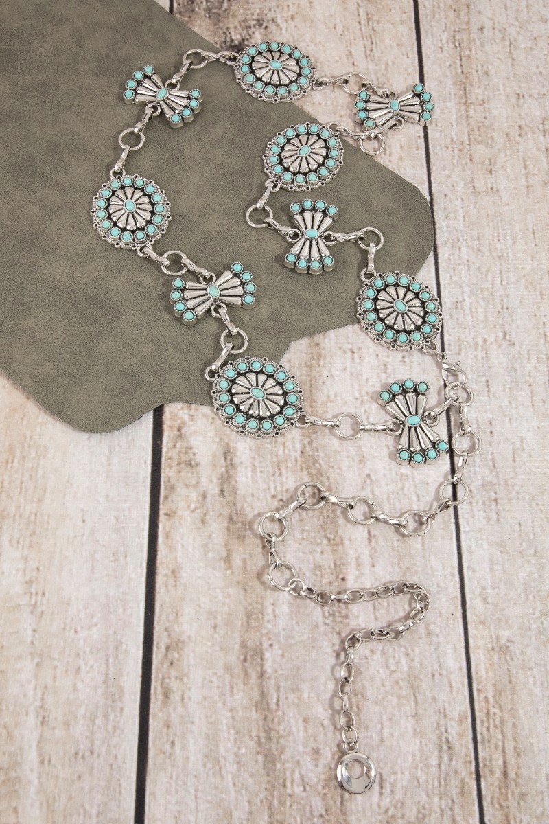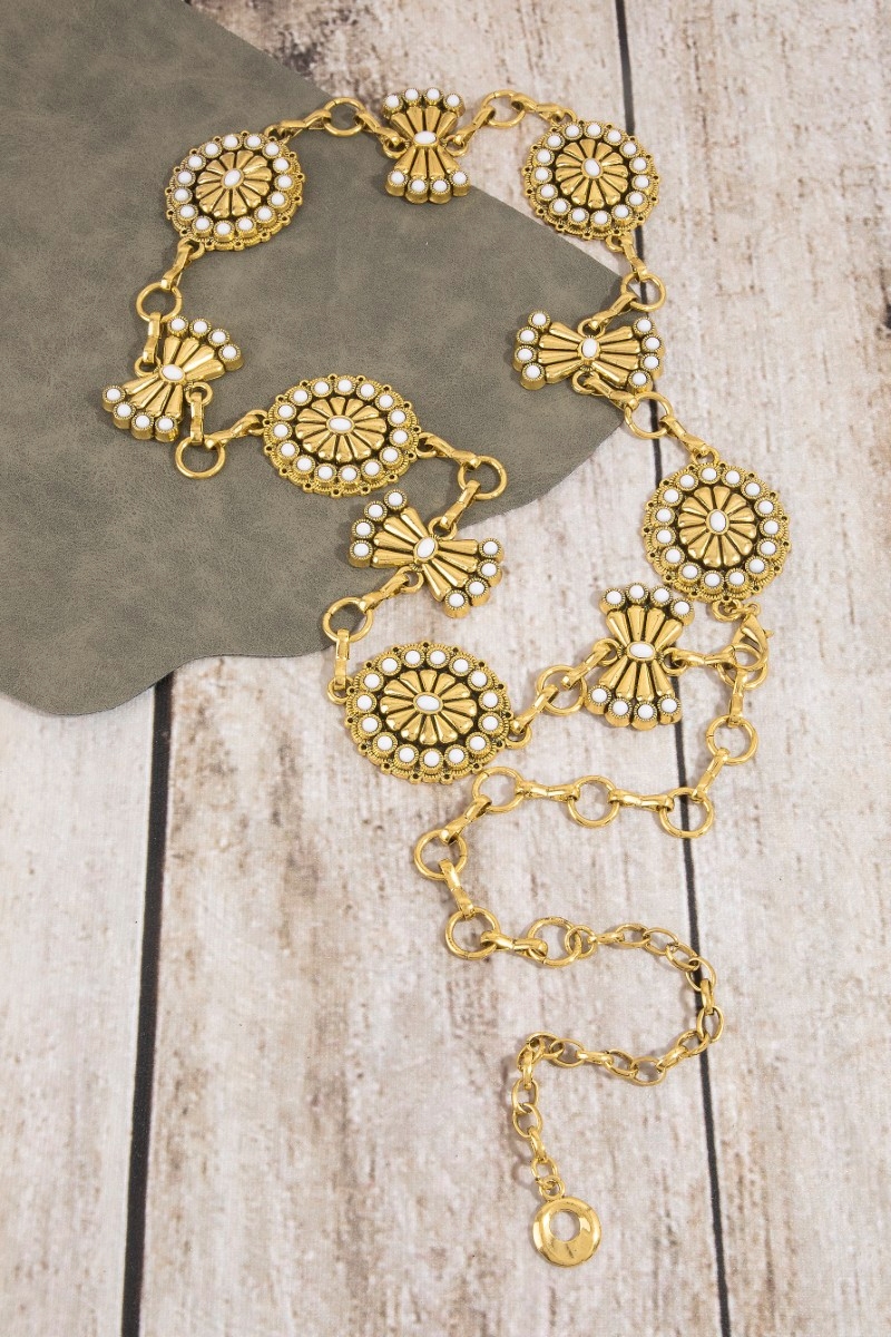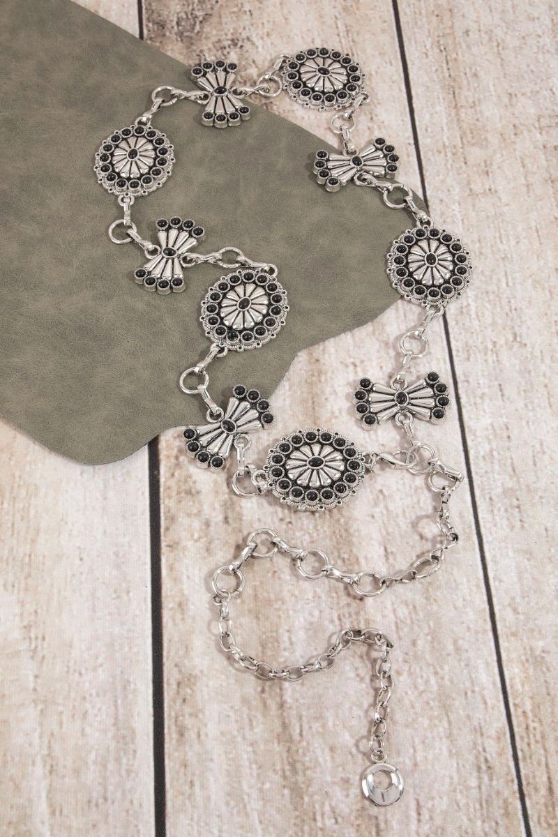 - This chain belt brings a unique stone daisy concho style. Explore a blend of classic charm and contemporary flair.