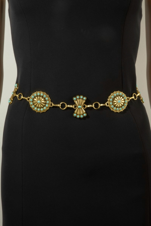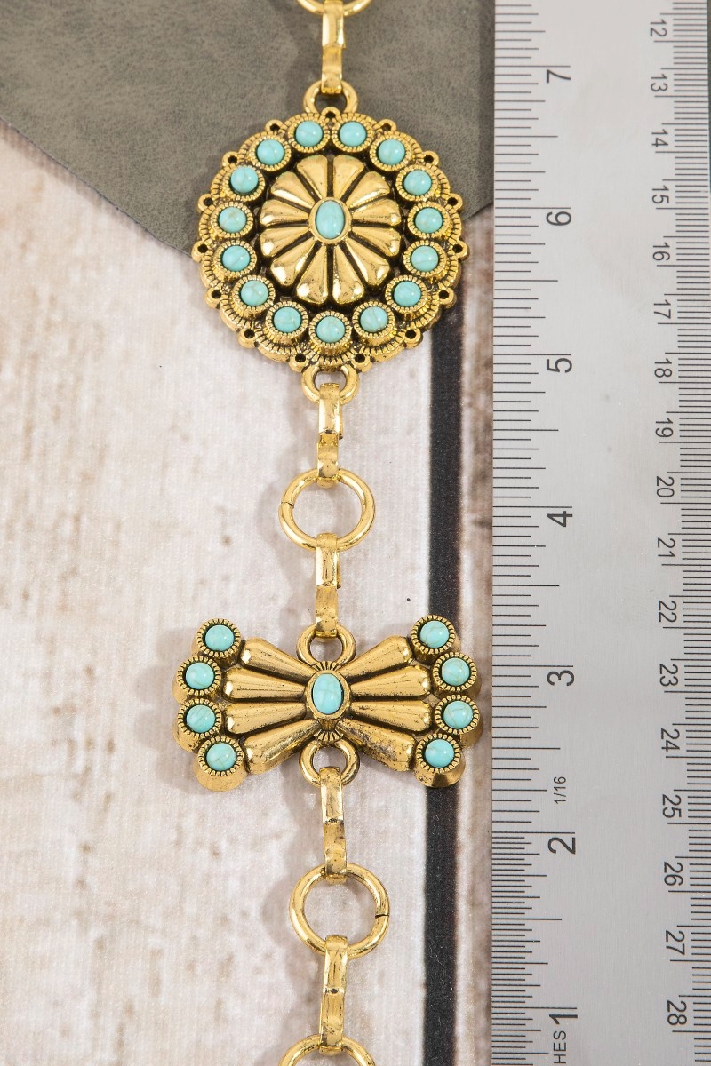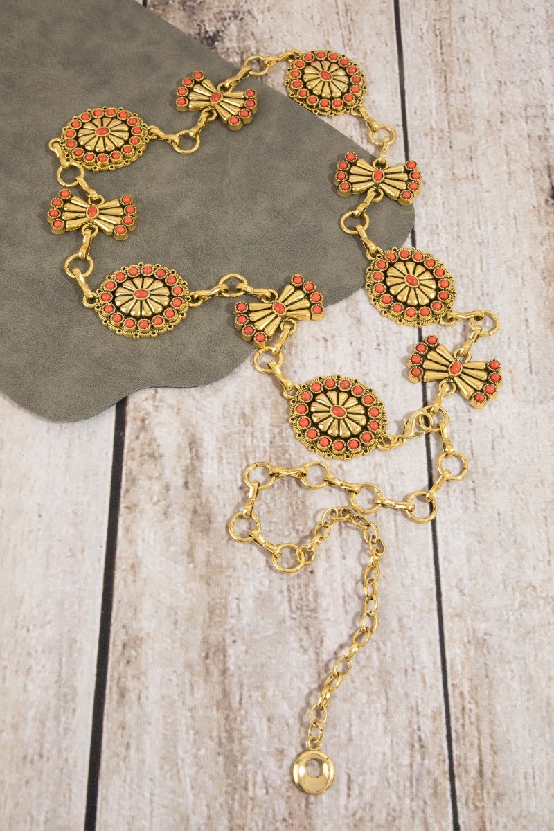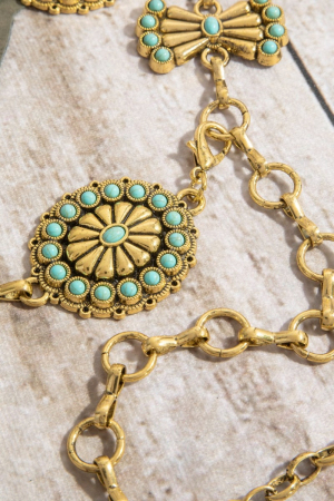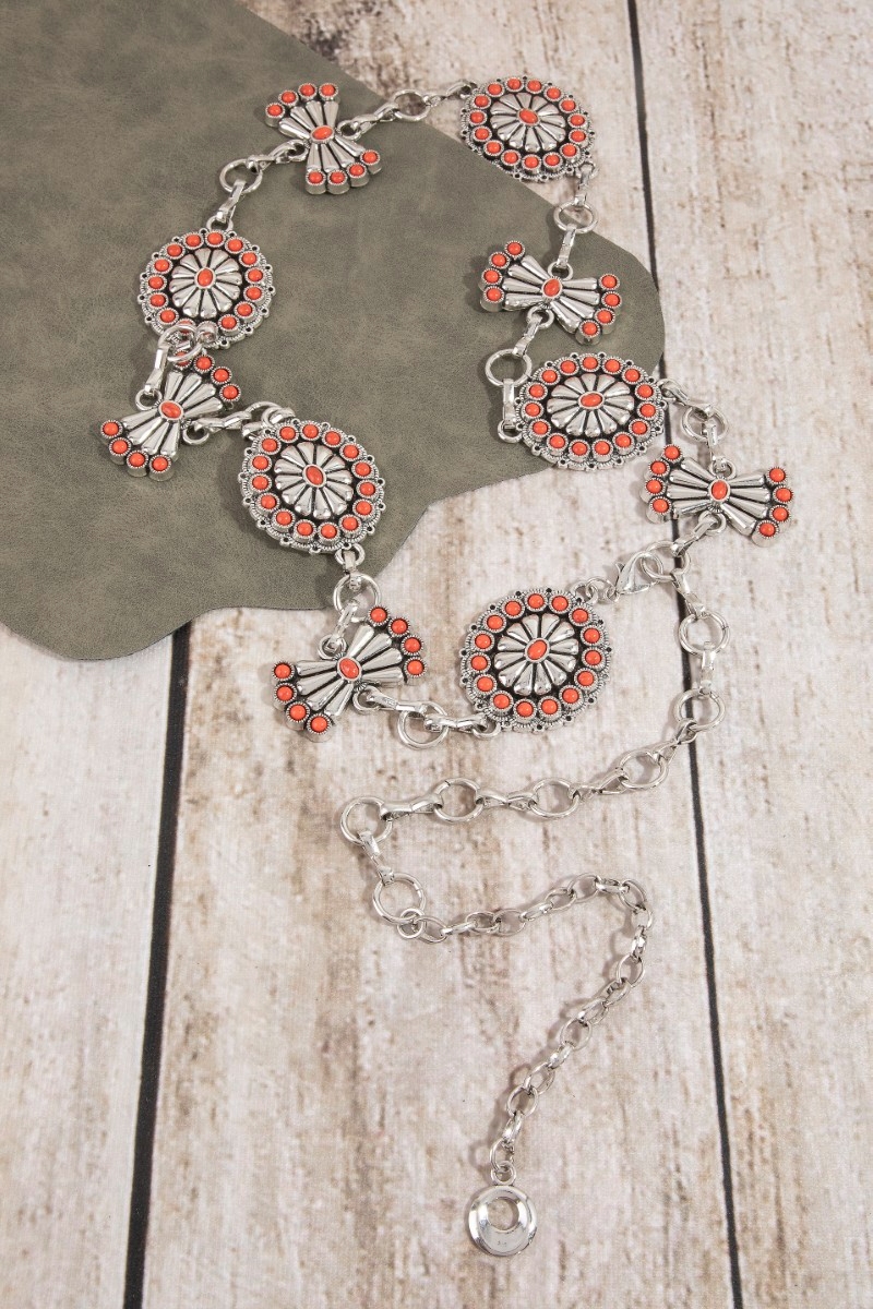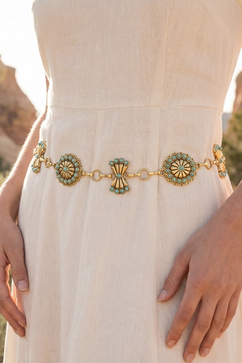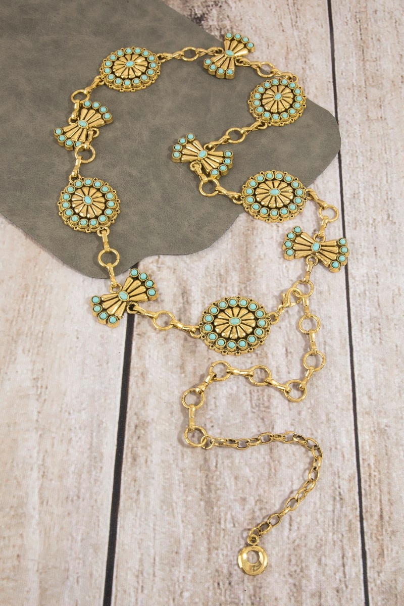 - This chain belt brings a unique stone daisy concho style. Explore a blend of classic charm and contemporary flair.