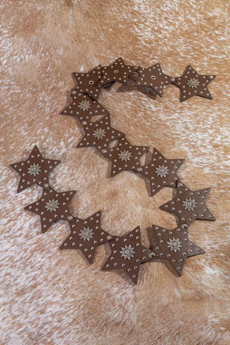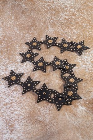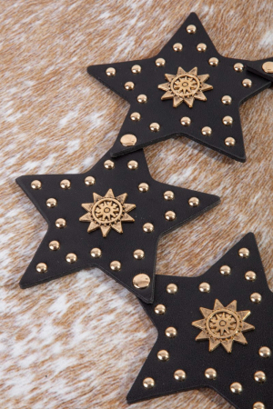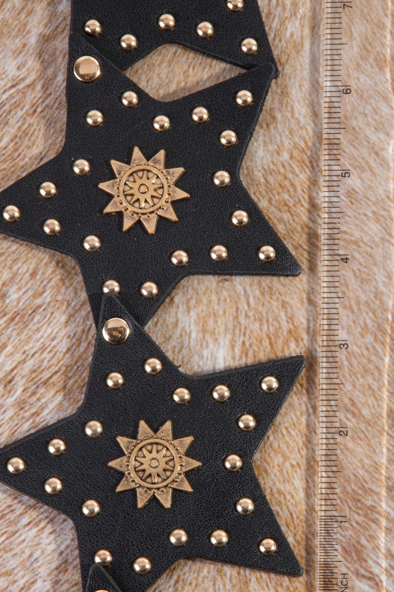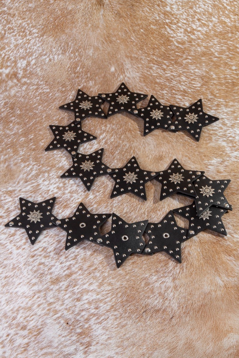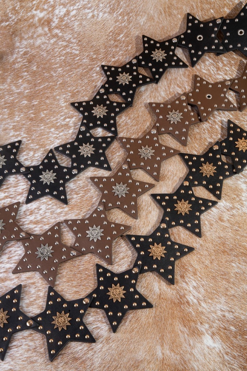- This leather belt displays a vibrant studded stars link vegan style. Redefine your look effortlessly with this standout, on-trend piece.