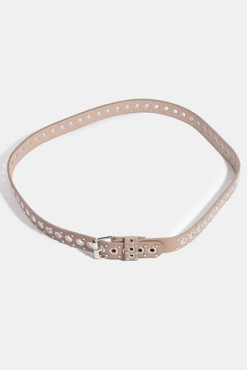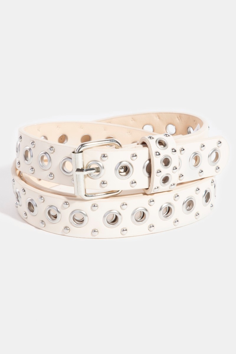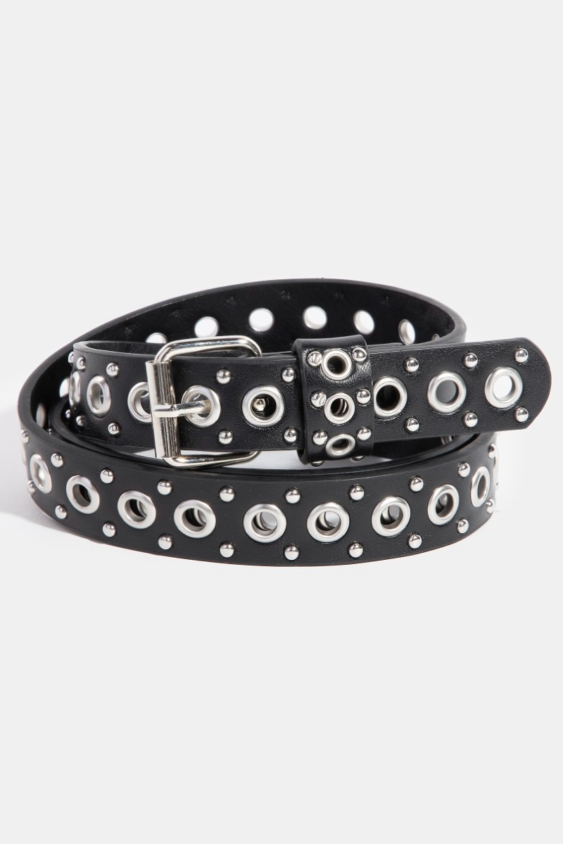 - This faux leather belt showcases a timeless studs and grommet style. Step into a world of refined taste as this faux leather belt effortlessly refines the details of your outfit.