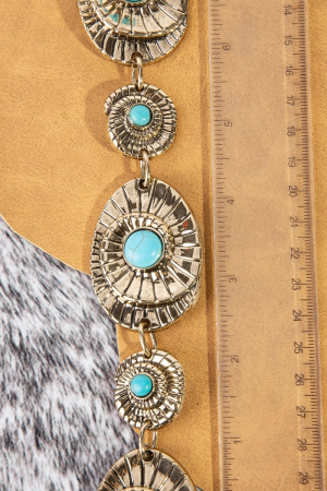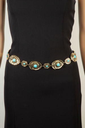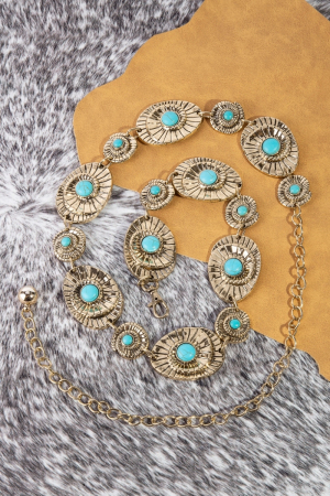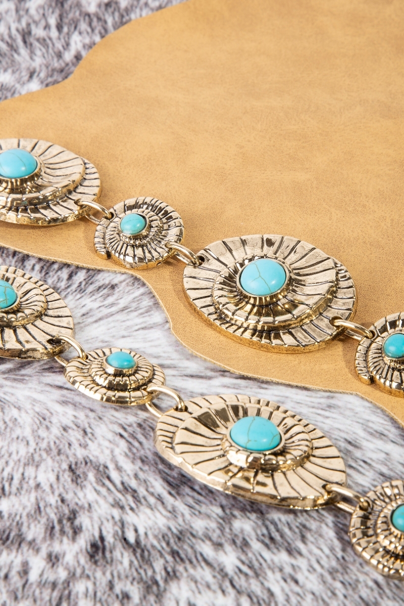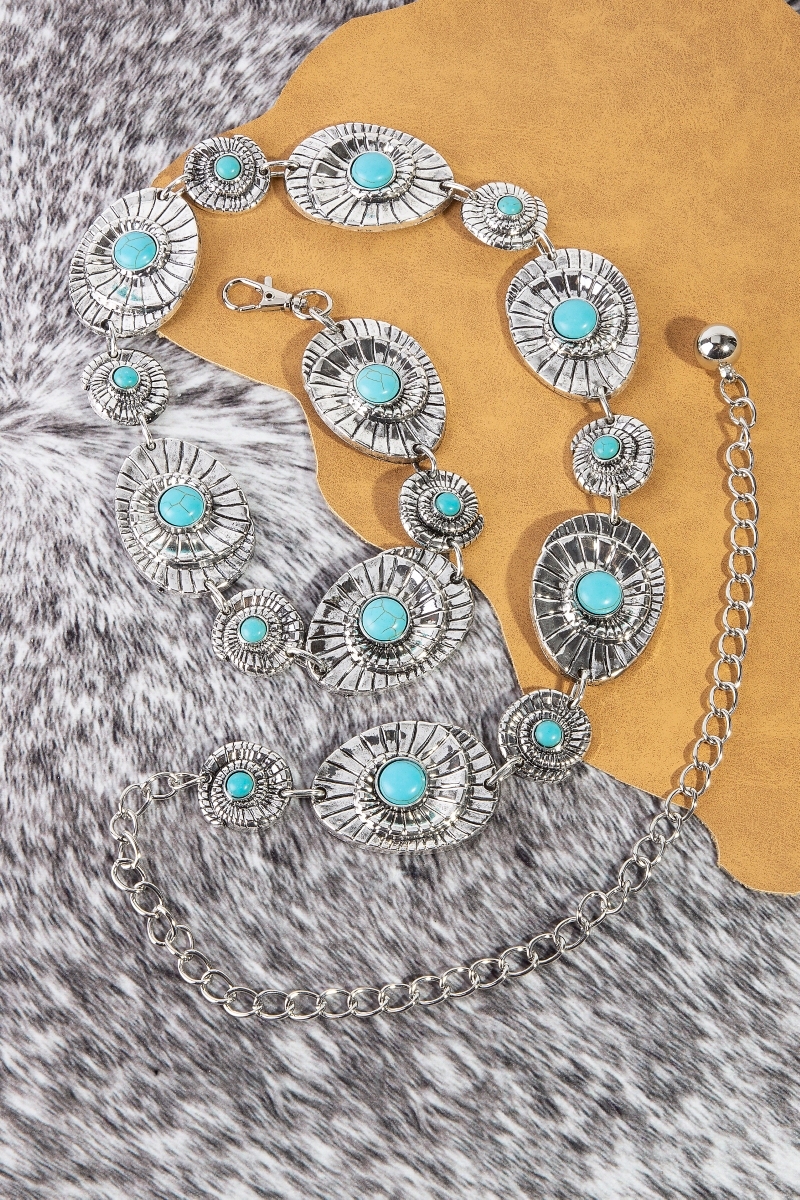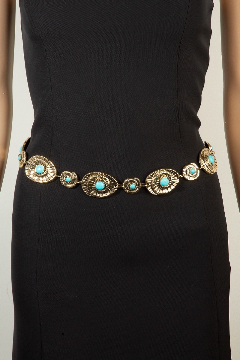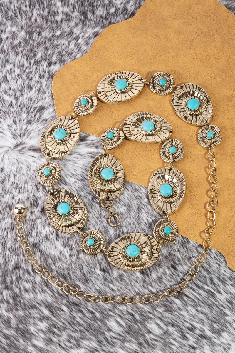 - This chain belt showcases a timeless turquoise stone spiral concho style. Discover the perfect balance of functionality and fashion.