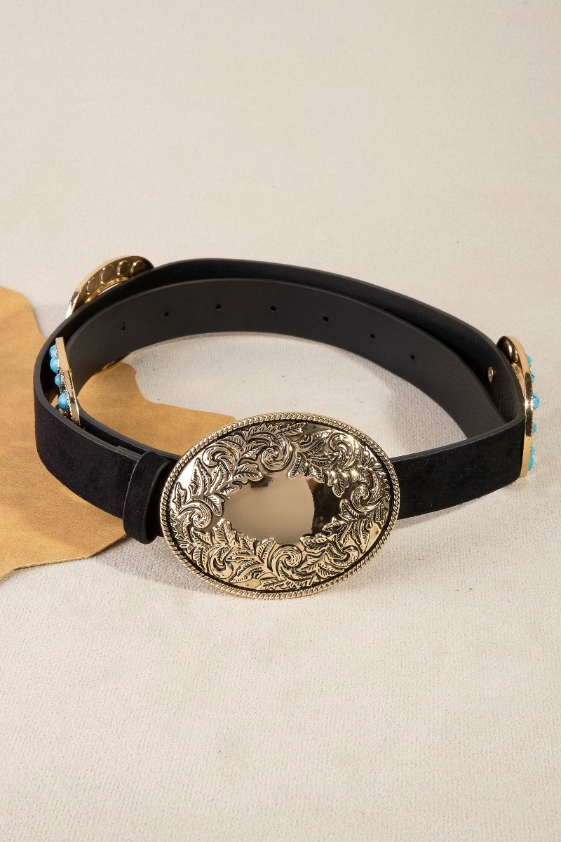 Hammered Oval Buckle Embroidered Vegan Leather Belt