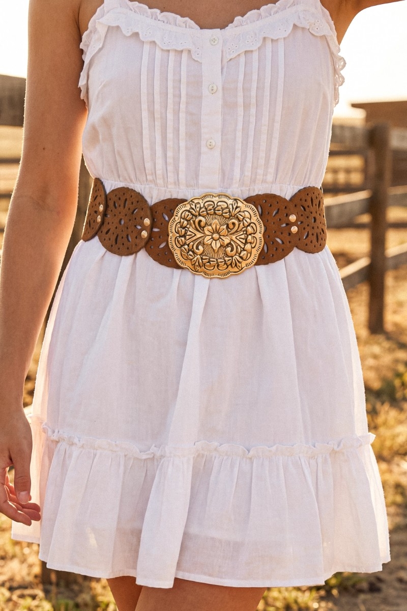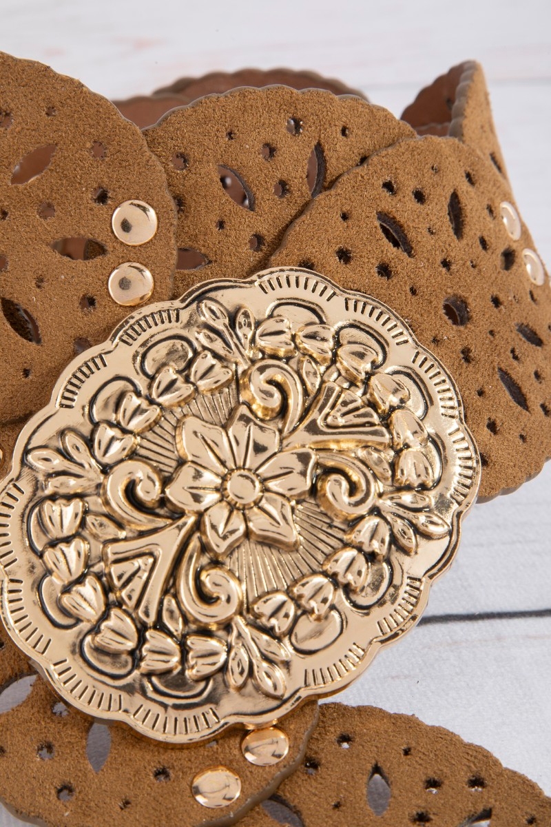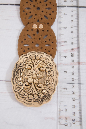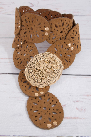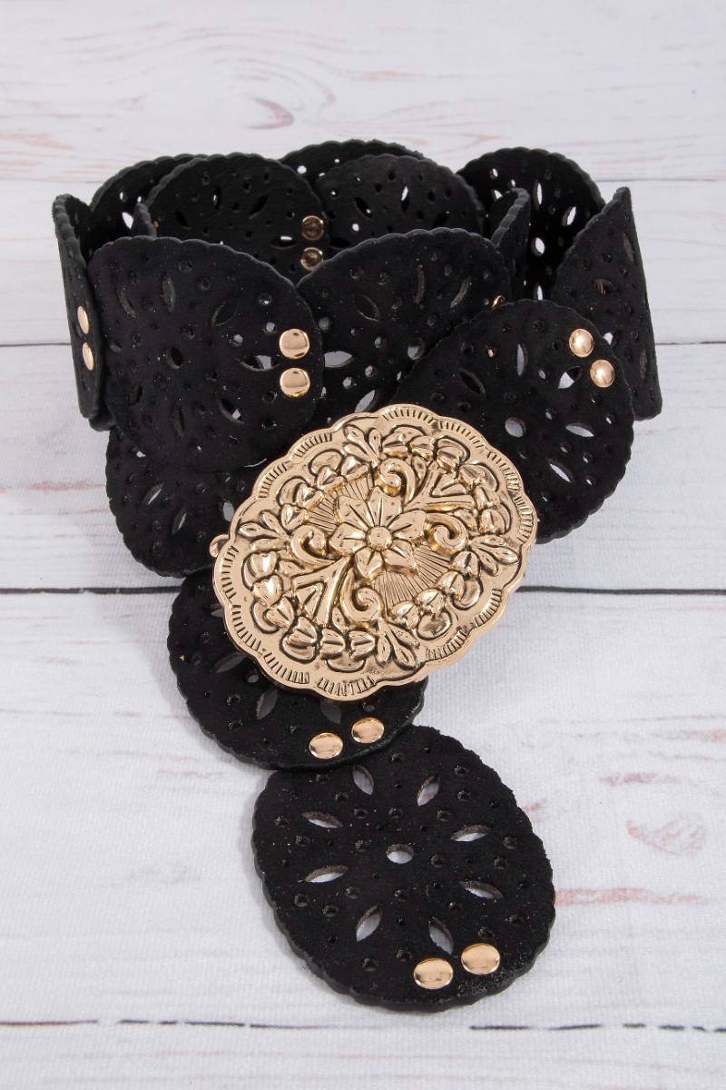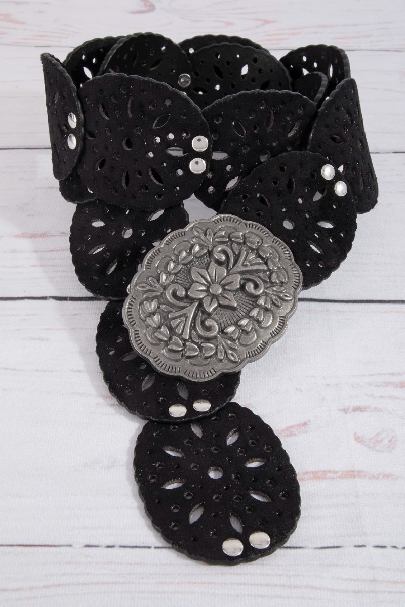 • This leather belt adds a modern embroidered floral buckle vegan style. Unveil modern elegance with this subtly intricate leather belt.