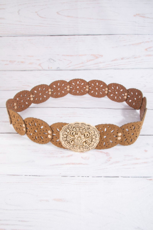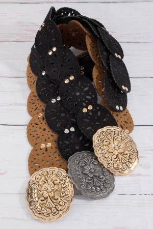 Hammered Oval Buckle Embroidered Vegan Leather Belt