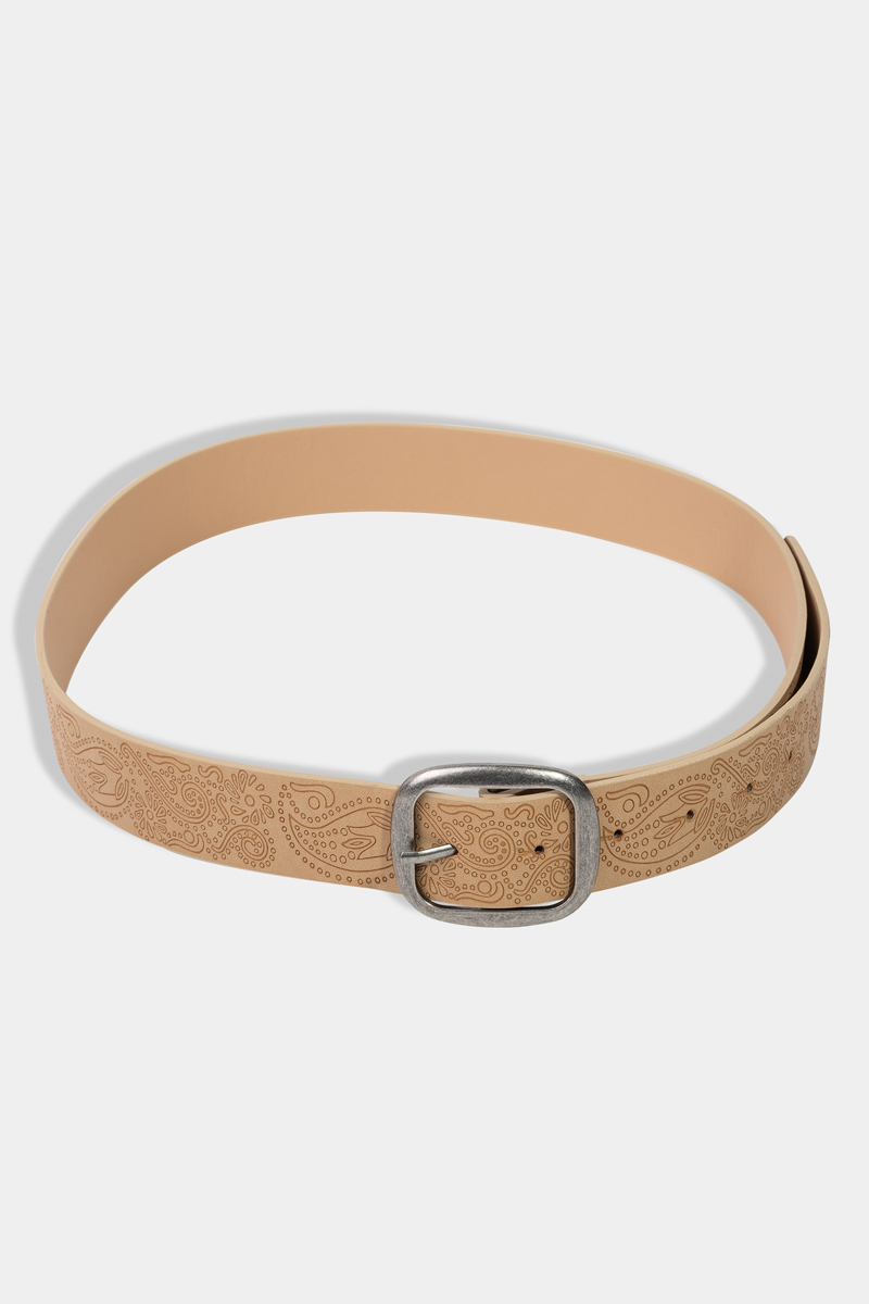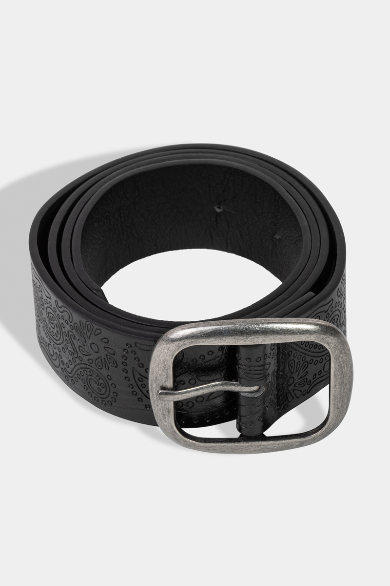 • This faux leather belt displays a fashionable etched floral style. Immerse yourself in fashion finesse with this statement faux leather belt.