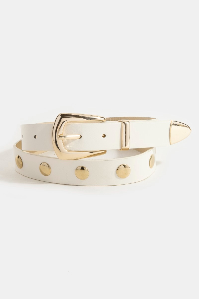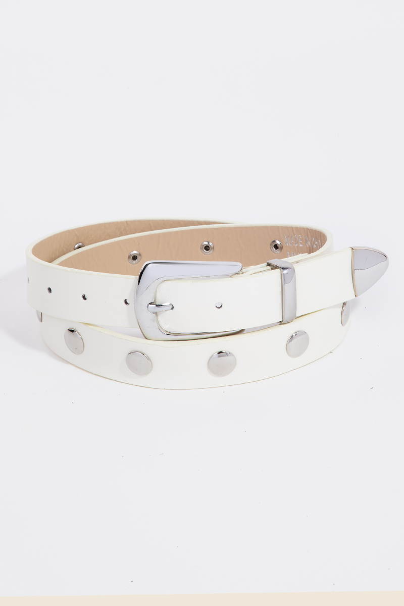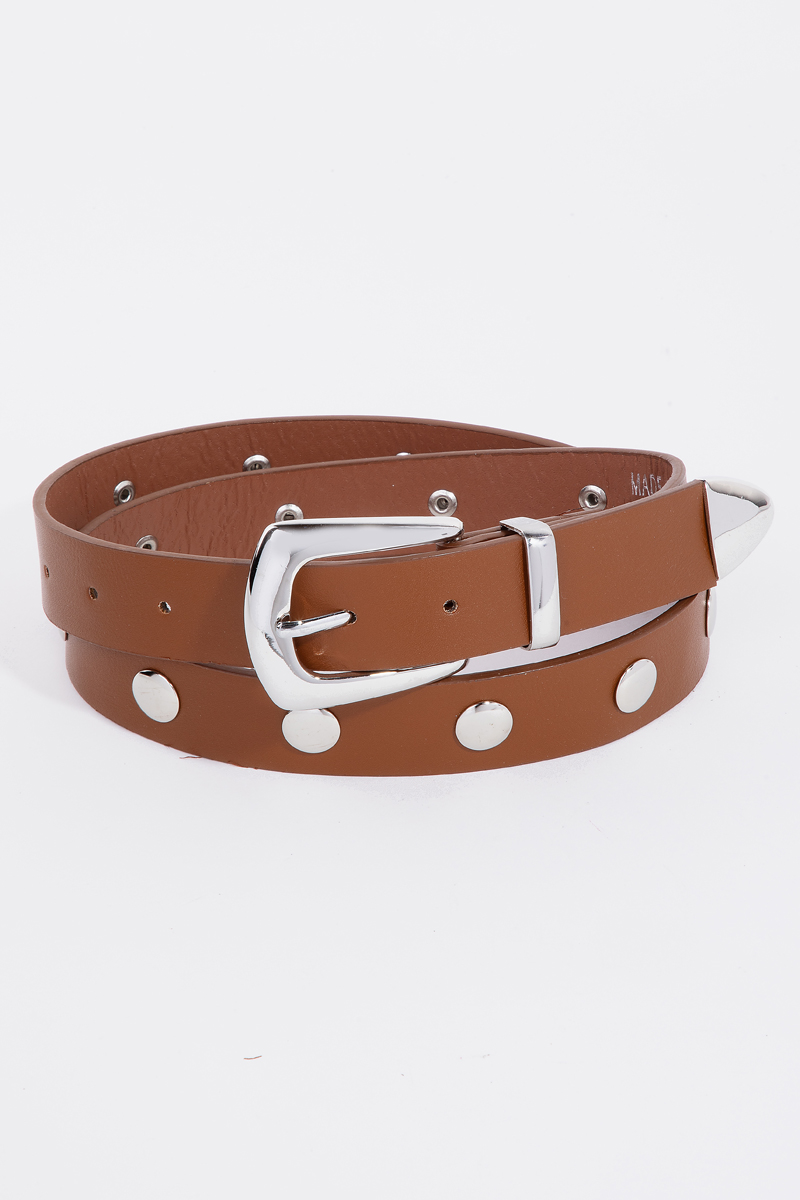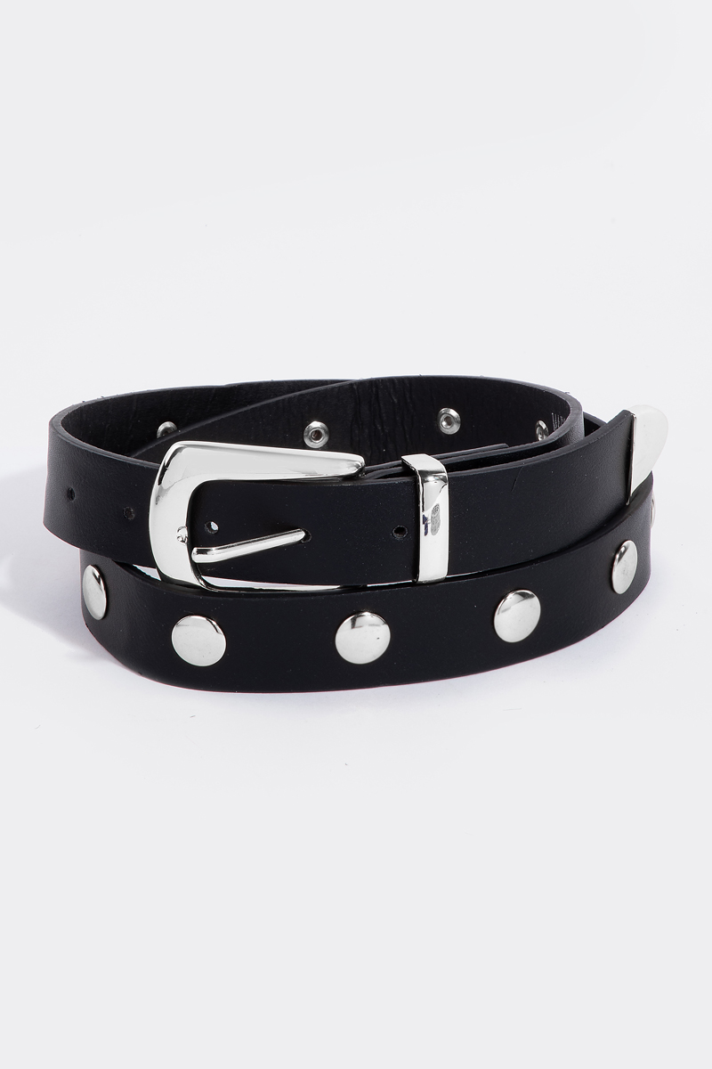 - This faux leather belt adds a modern flat metallic riveted style. Elevate your ensemble with this chic, timeless faux leather belt.