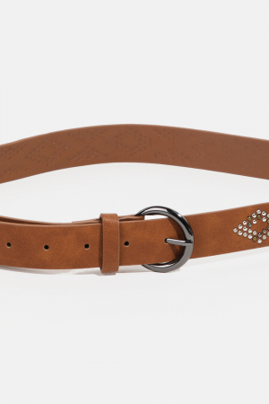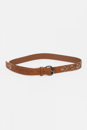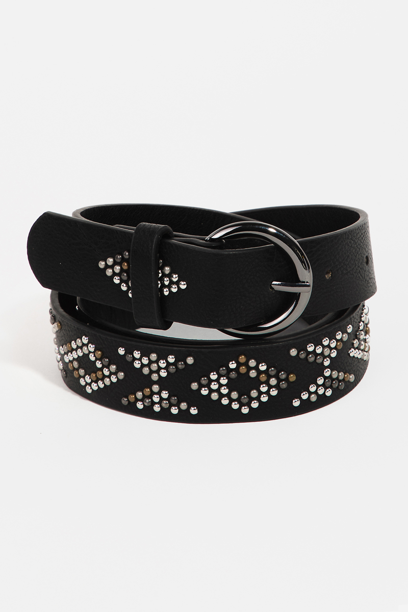 - This faux leather belt brings a stunning geometric studded style. Experience a burst of creativity in accessorizing as this piece effortlessly sets the tone for your unique style.