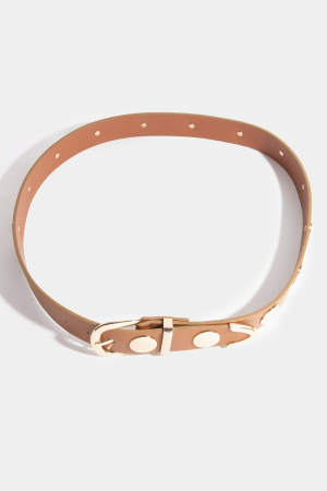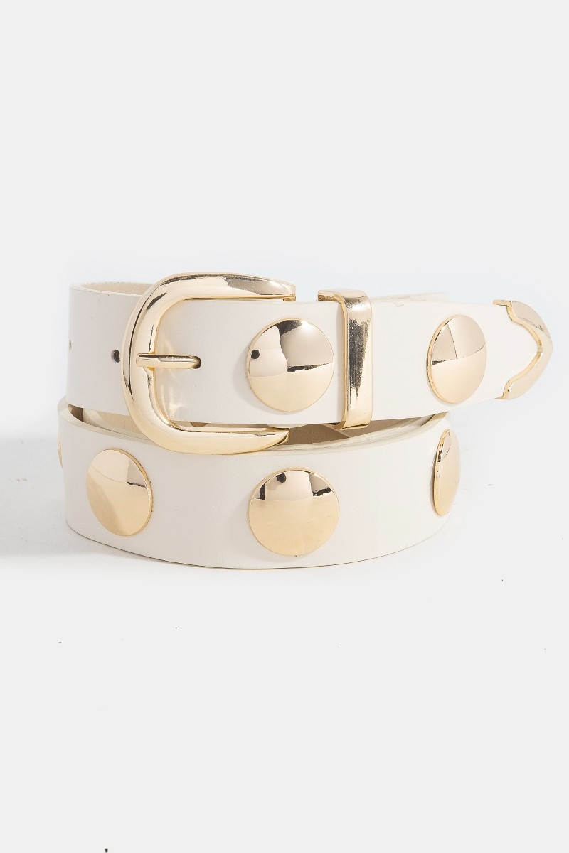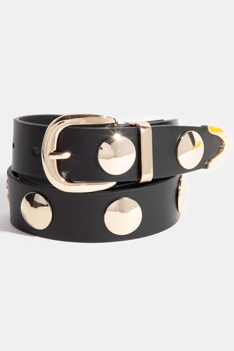 - This faux leather belt introduces a stunning metallic disc studded style. Celebrate individual style with this versatile, eye-catching addition.