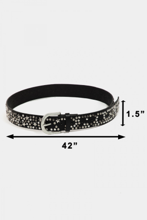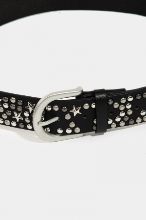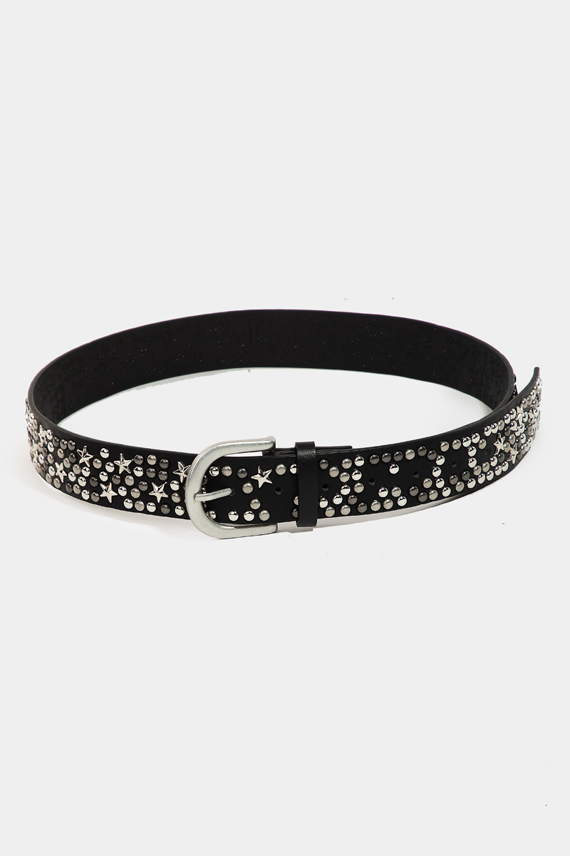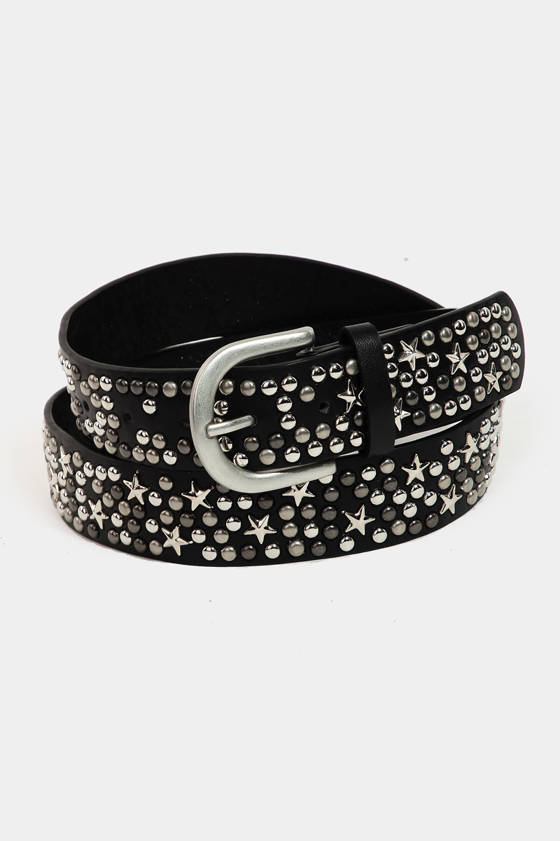 • This faux leather belt features a fashionable metallic stars and stud style. Indulge in the allure of exquisite craftsmanship as this faux leather belt effortlessly adds a touch of luxury to your attire.