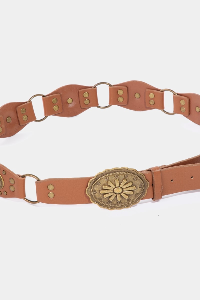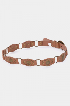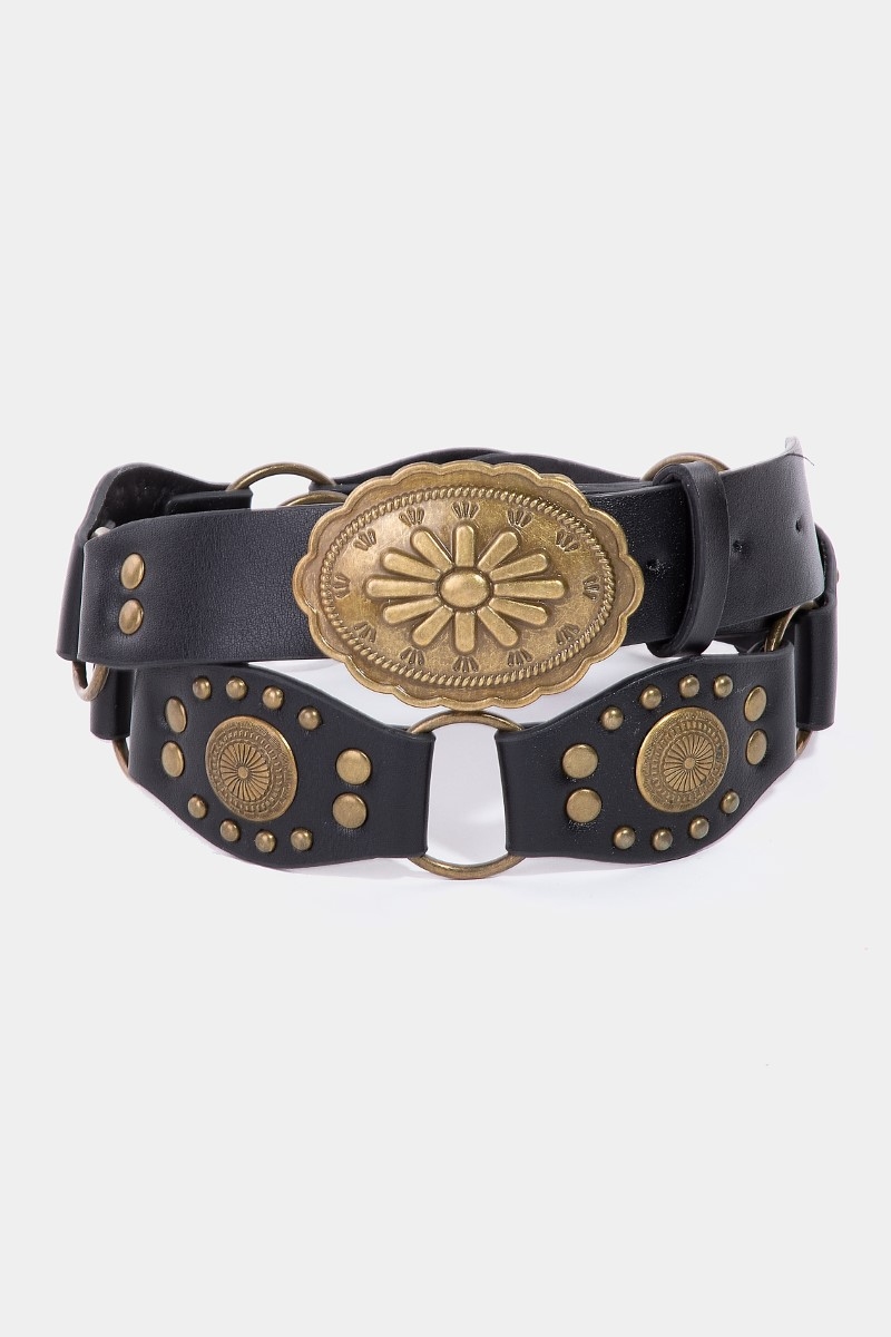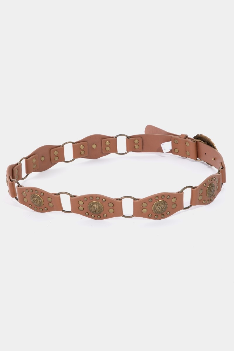 • This belt showcases a timeless oval concho disc leather link style. Delight in the intricate details that make this belt an essential element in expressing your fashion identity.