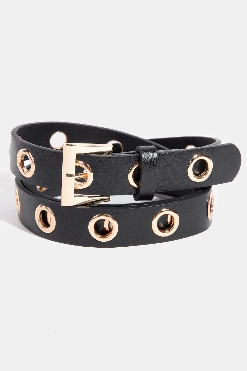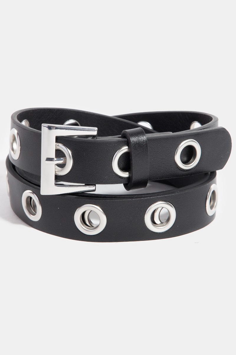 • This faux leather belt showcases a unique simple grommet style. Celebrate the art of accessorizing with this piece that effortlessly encapsulates modern trends.