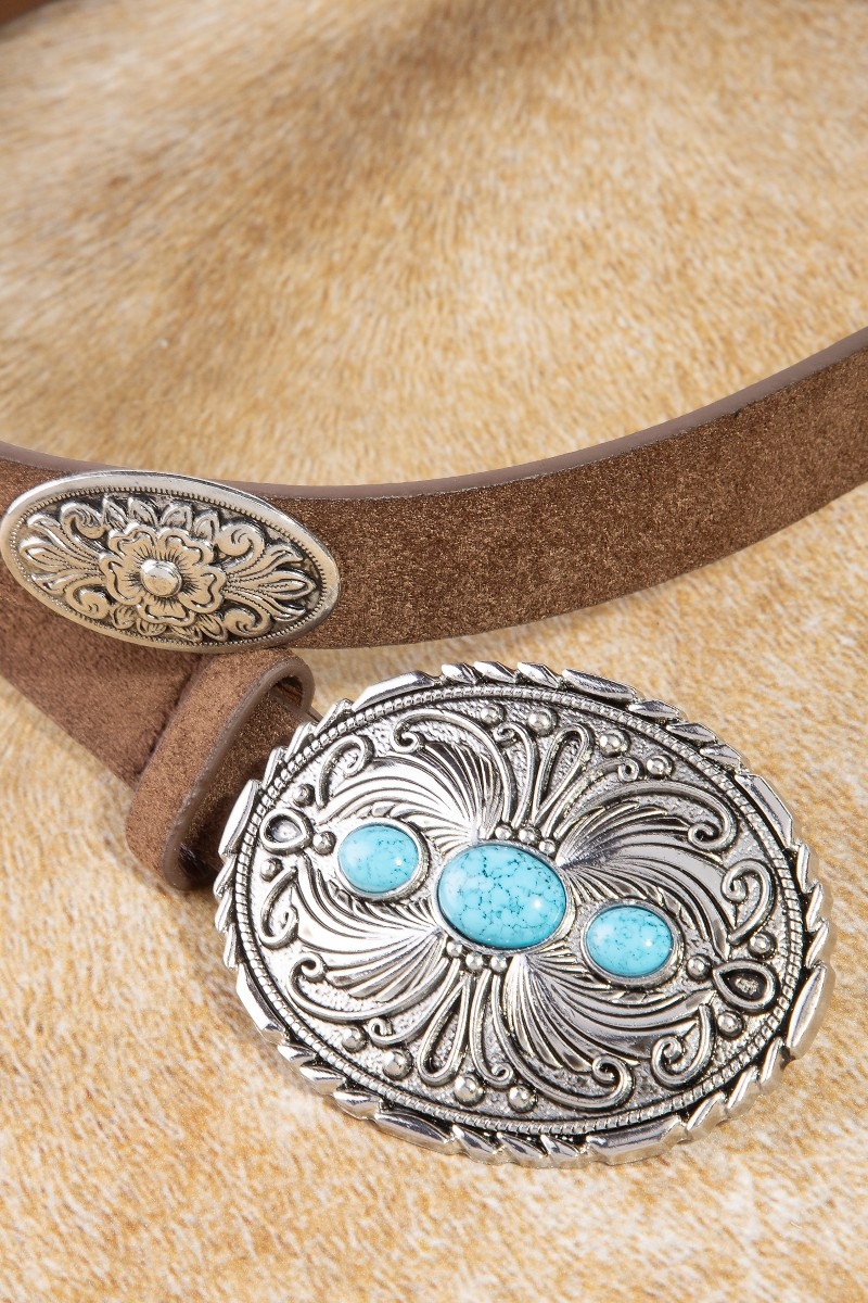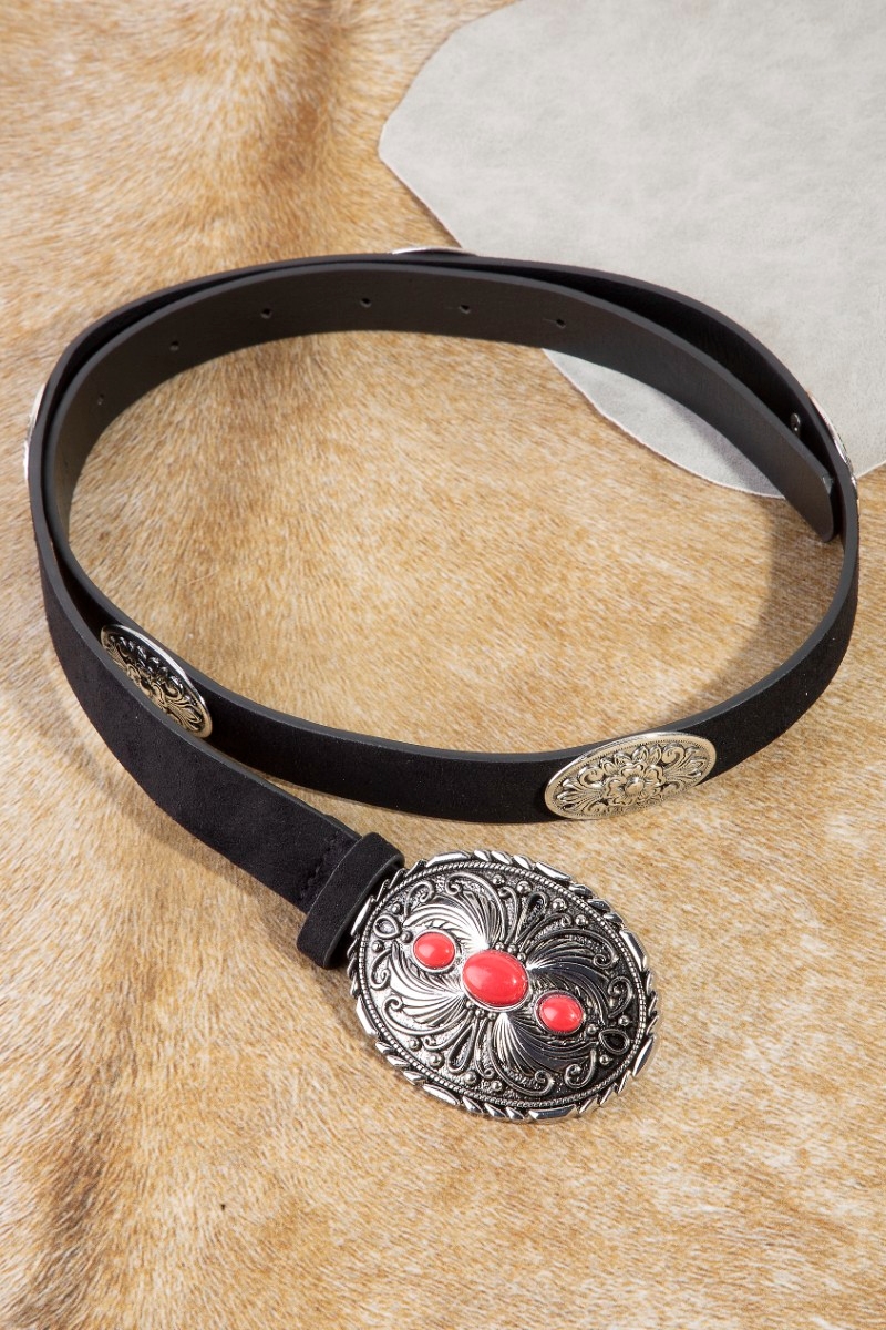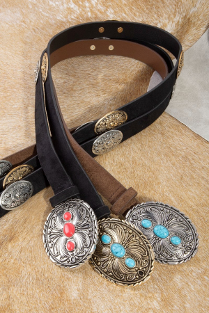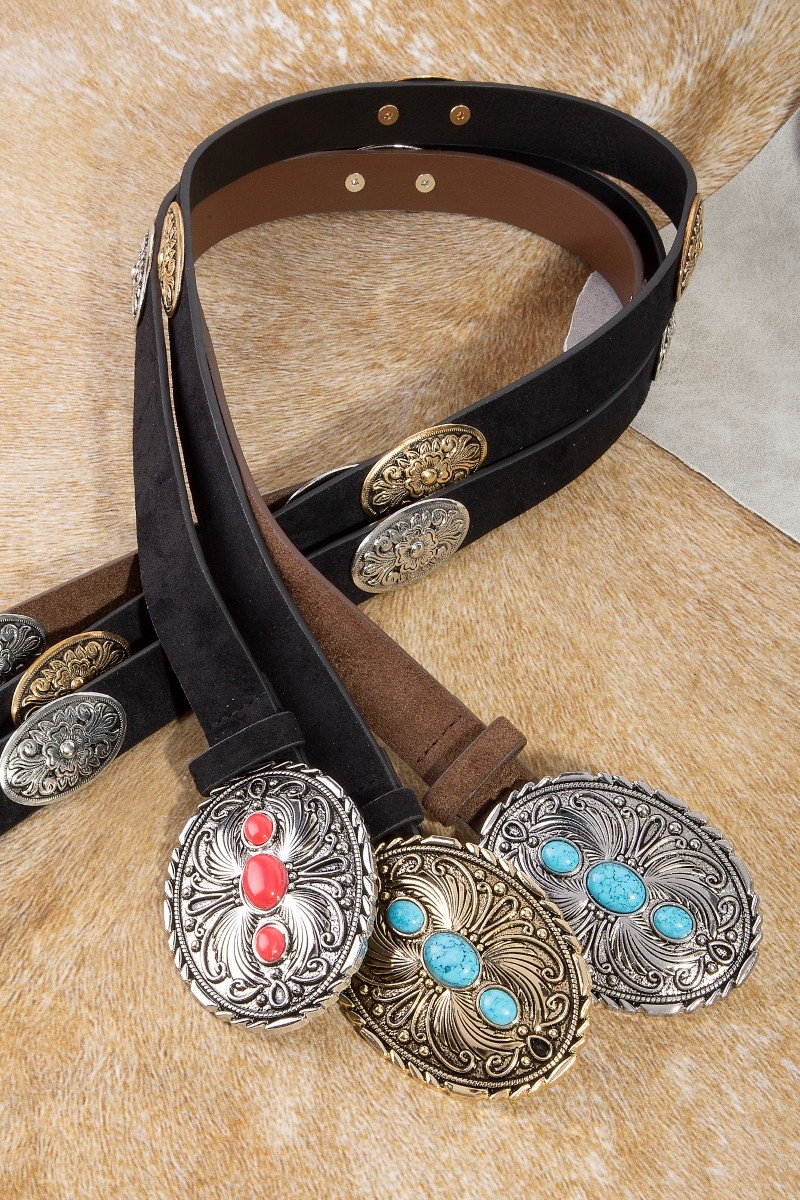 - This leather belt showcases a unique western oval concho style. Savor the allure of detailed craftsmanship in this exquisite leather belt.
