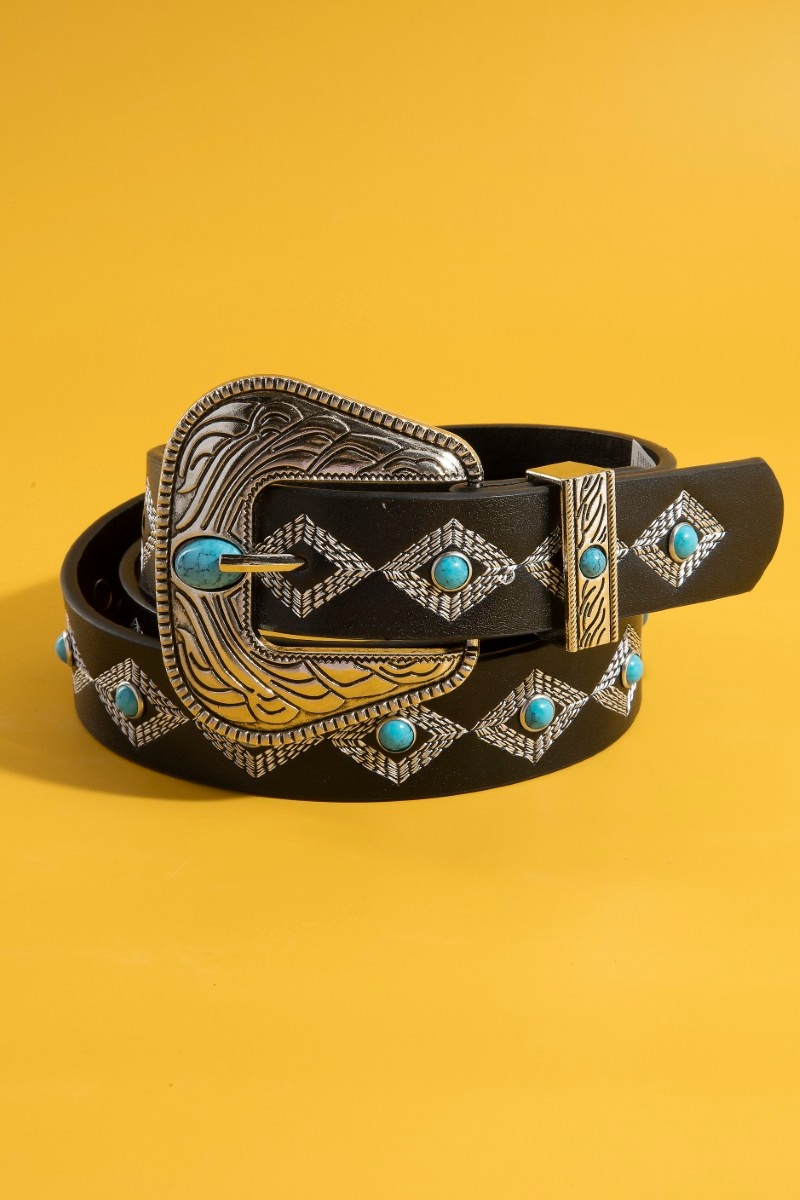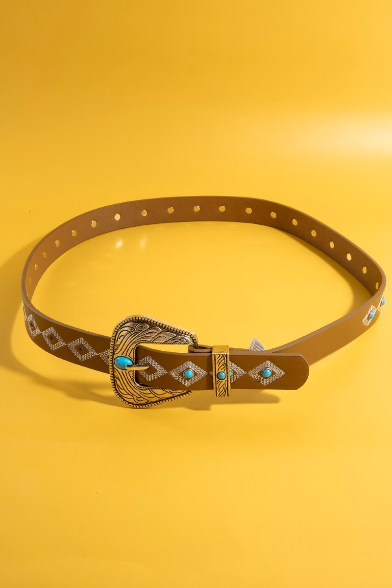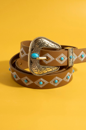 • This faux leather belt showcases a timeless western embroidered buckle pattern style. Experience the joy of accessorizing with this piece that effortlessly combines versatility and charm.