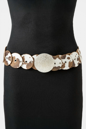 • This belt introduces a unique western inspired faux cowhide large round buckle style. Experience a subtle blend of modernity and classic charm as this belt effortlessly adorns your ensemble.