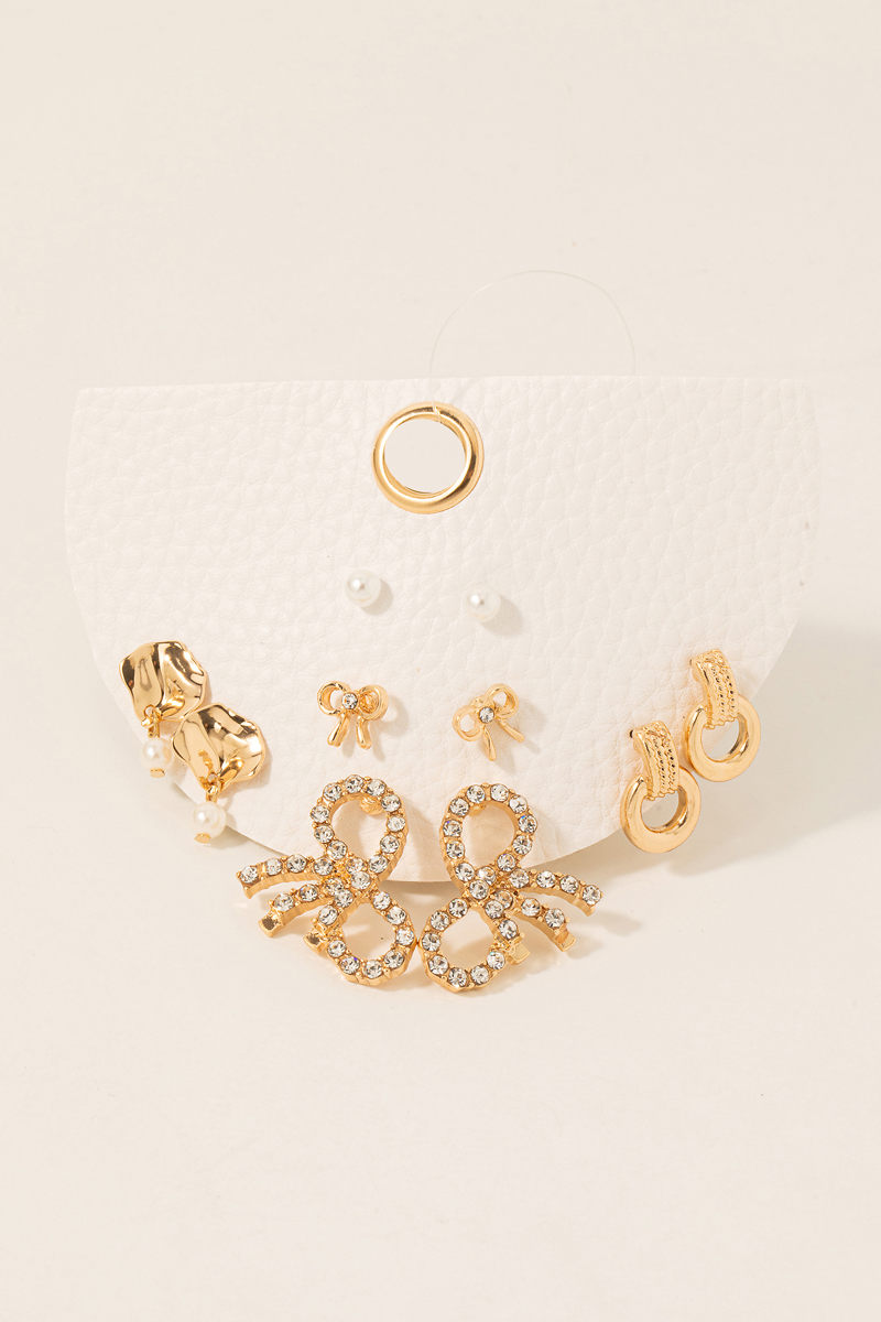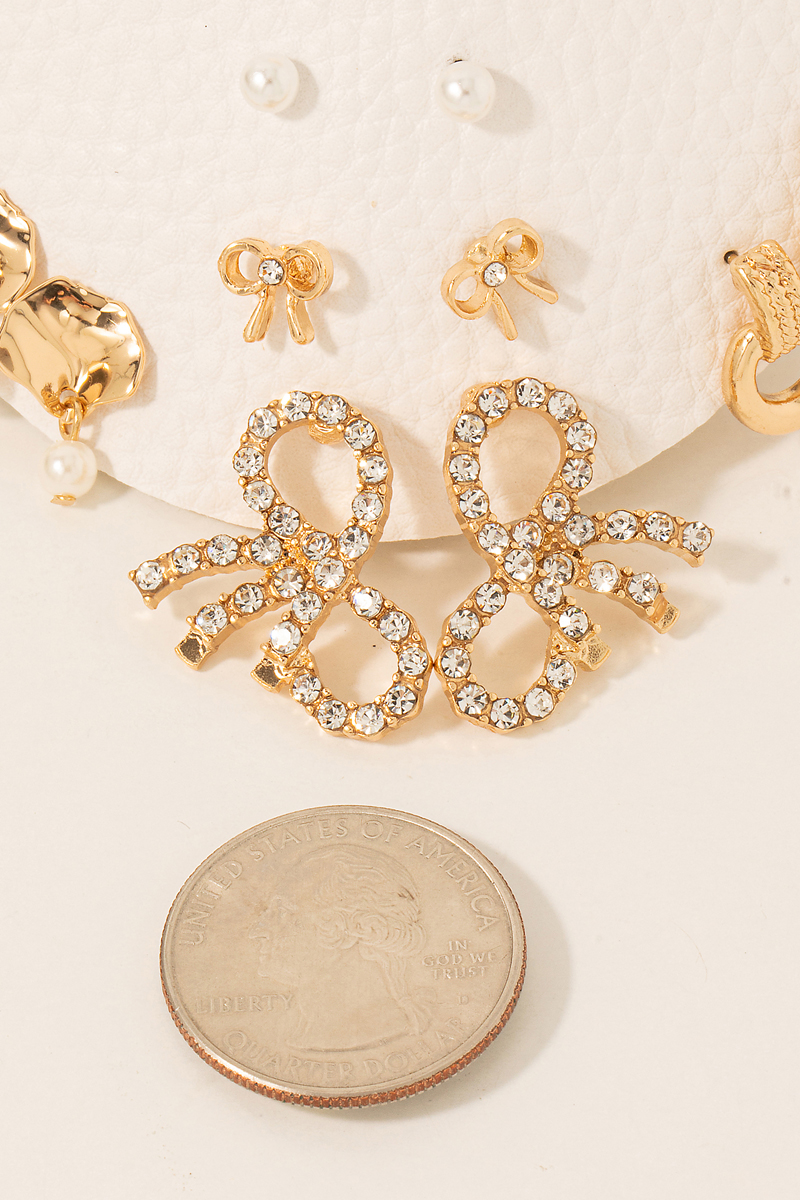 - This pair of earrings showcases a timeless assorted ribbon bow set style. Elevate your ensemble with this chic, timeless accessory.