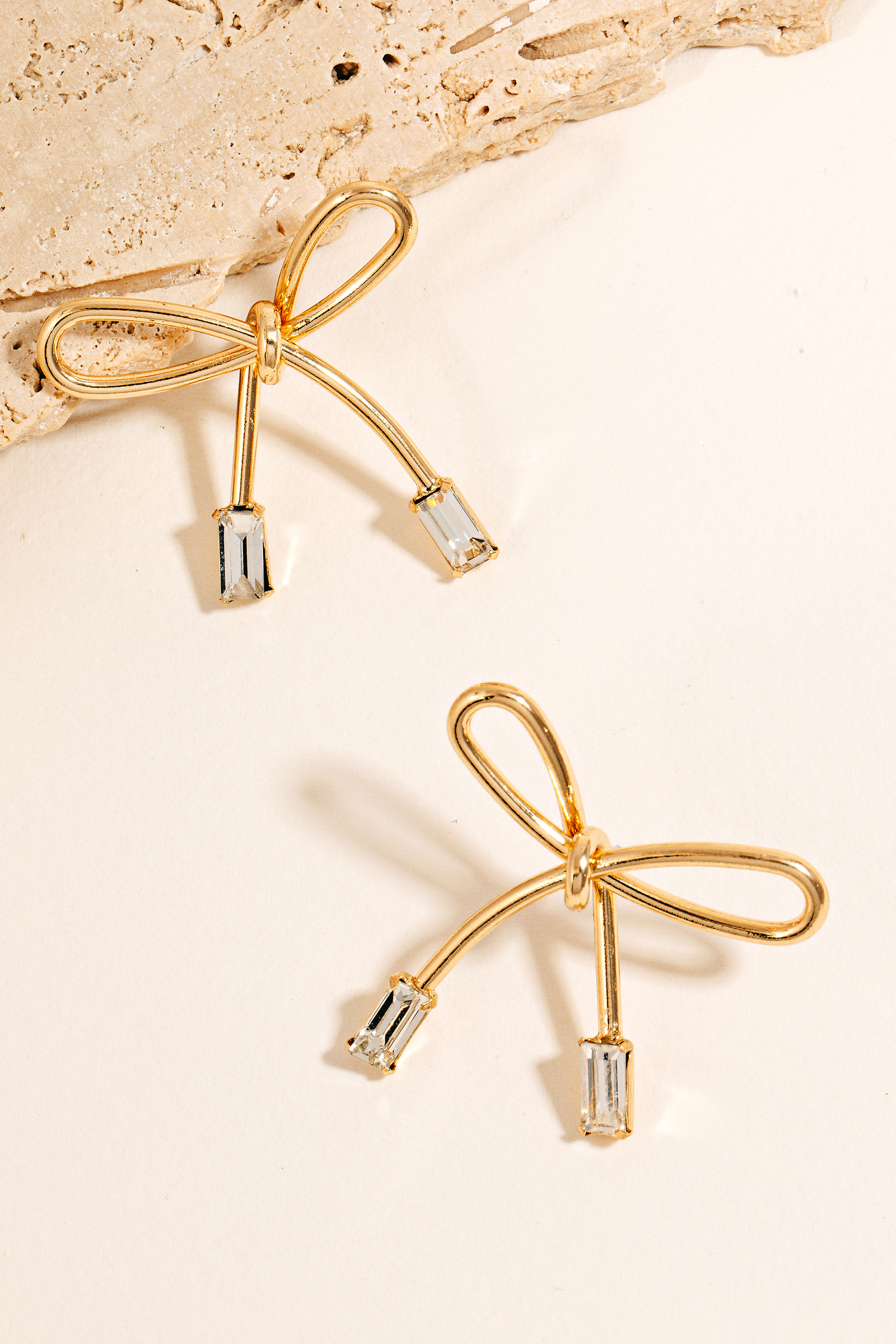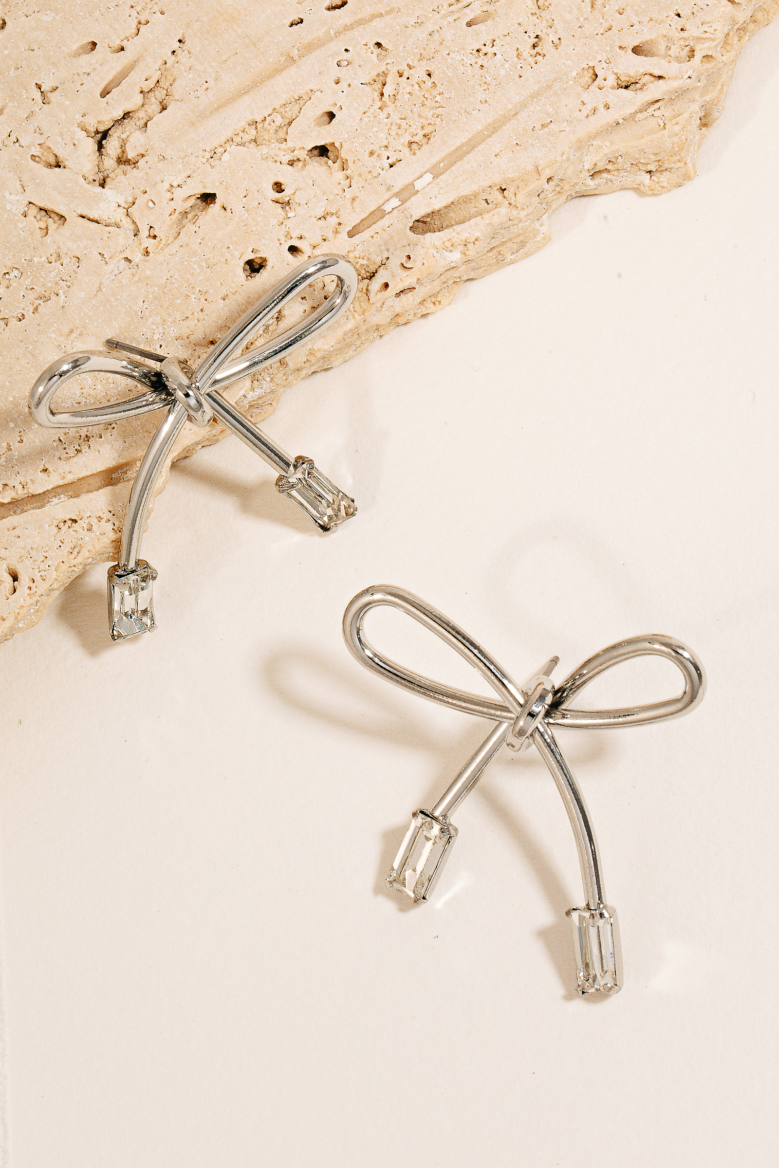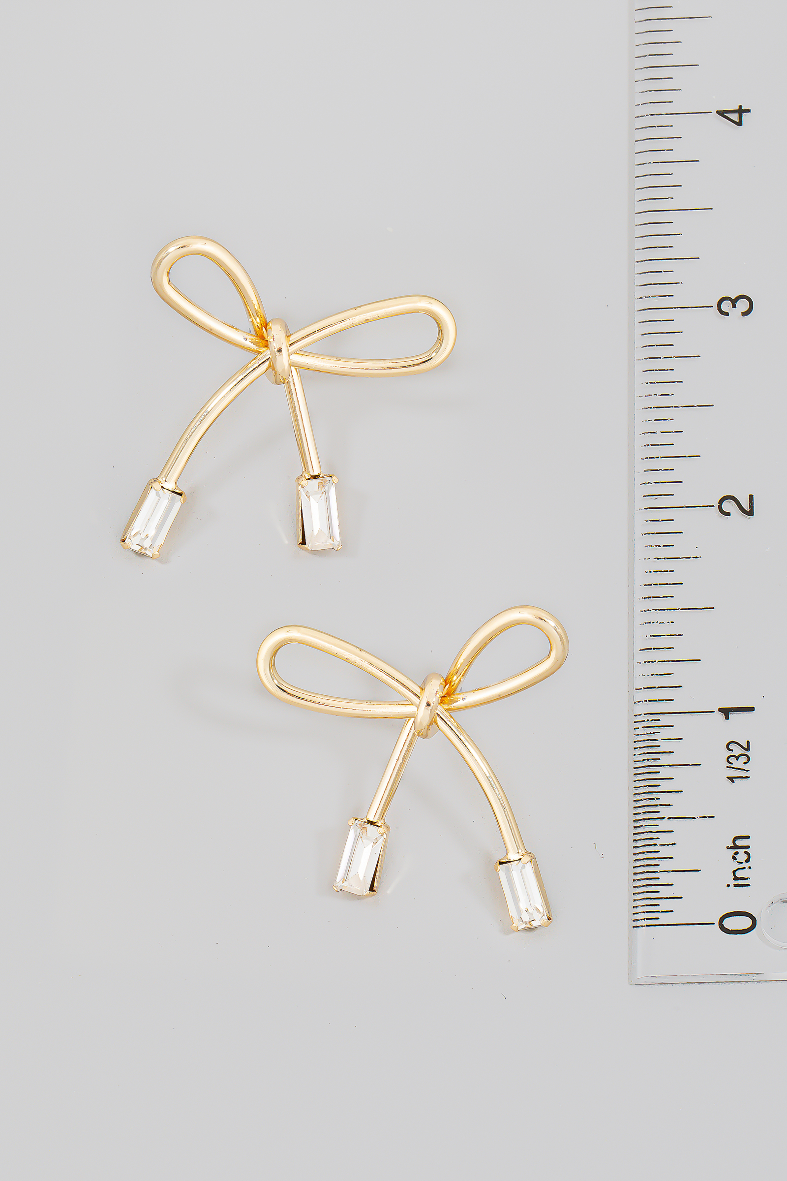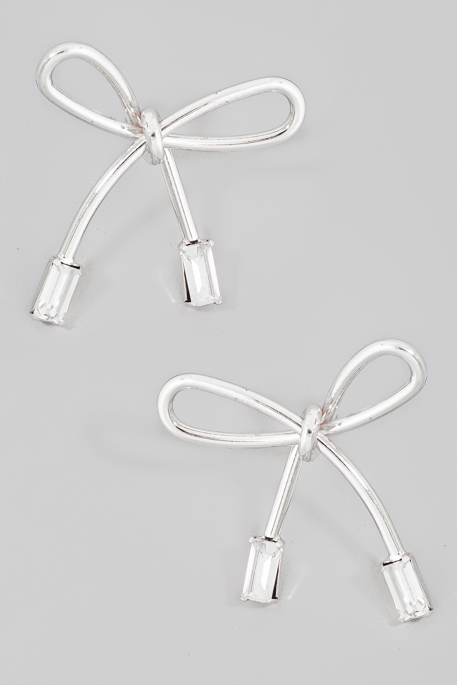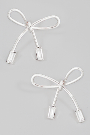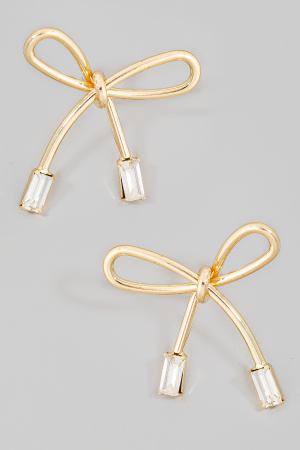 • This pair of stud earrings features a fashionable baguette ends ribbon bow style. Revel in the intricate design that effortlessly distinguishes this accessory, making it a statement piece.