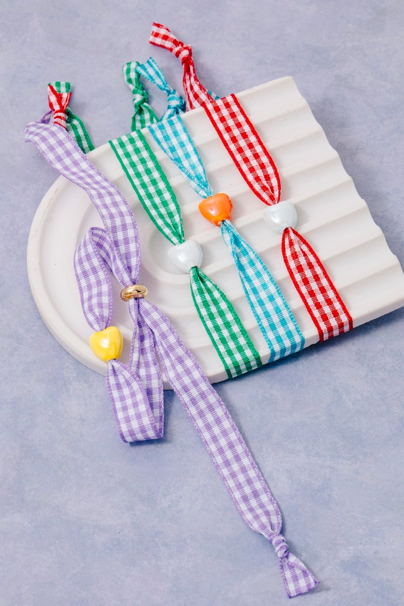 - This bracelet displays a fashionable ceramic heart charm plaid ribbon style. Elevate your ensemble with this bracelet that effortlessly captures the essence of refined fashion.