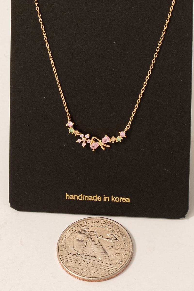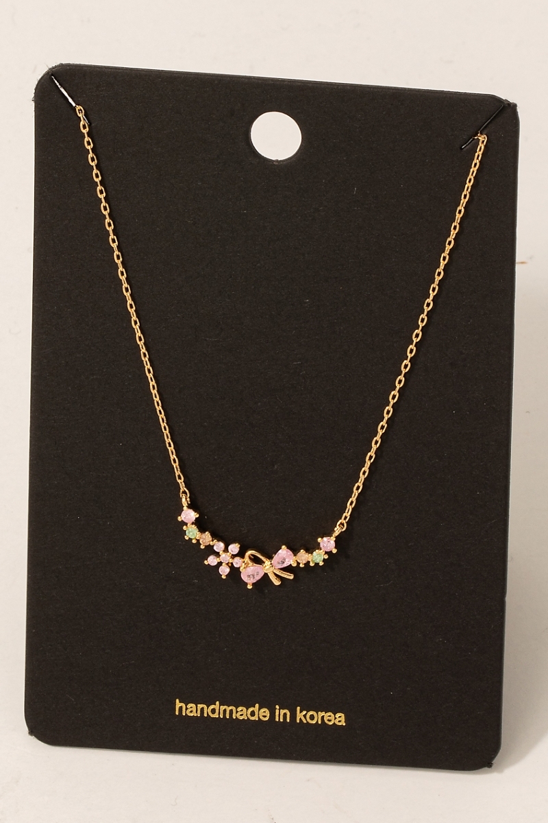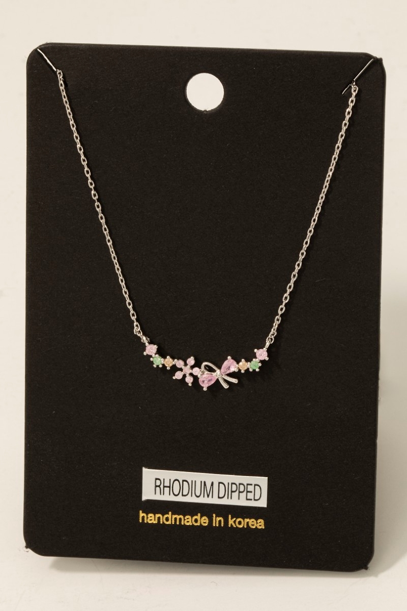 • This necklace features a fashionable cubic zirconia ribbon bow floral bar pendant style. Step into a world of refined taste as this necklace effortlessly refines the details of your outfit.