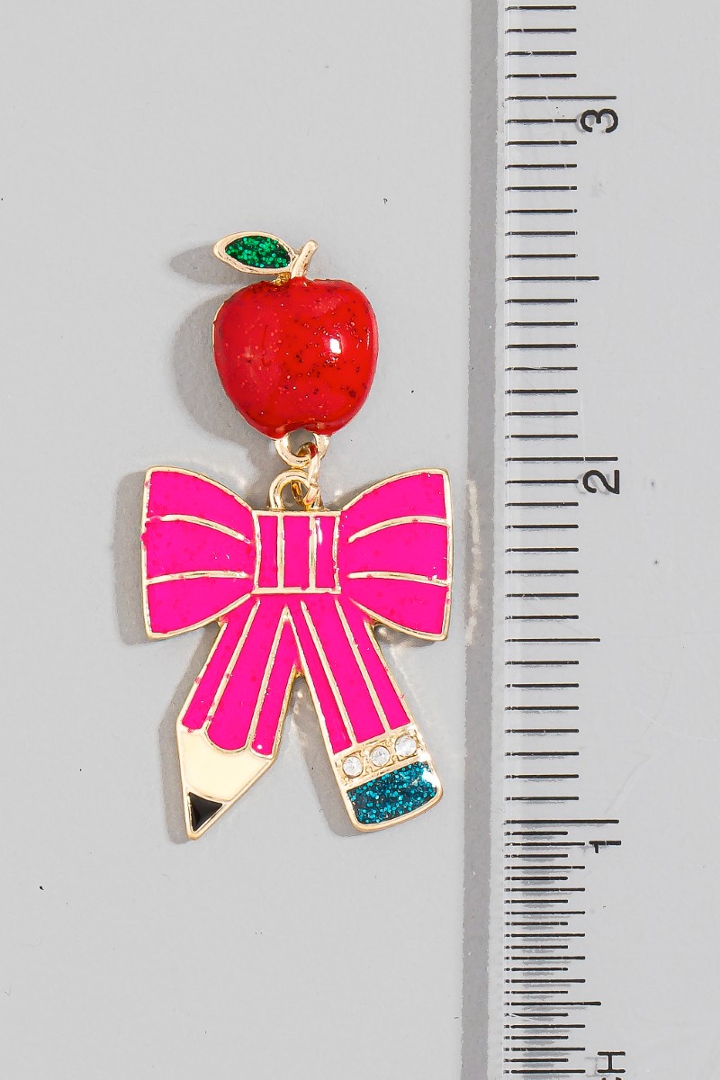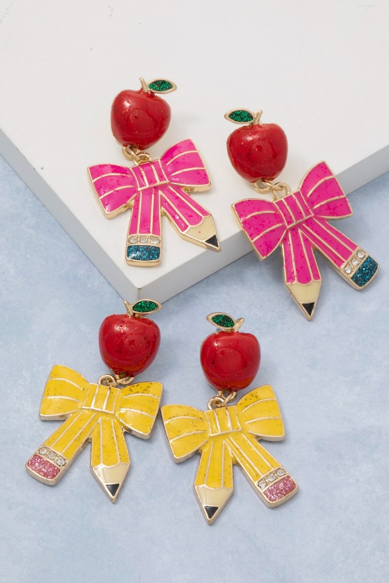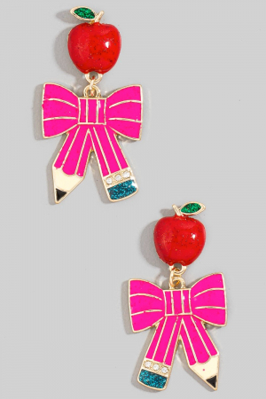 • This pair of dangle earrings brings a unique enamel pencil bow and apple stud style. Indulge in the artistry of accessorizing with this unique piece.