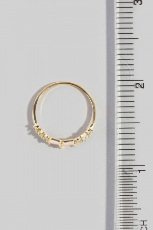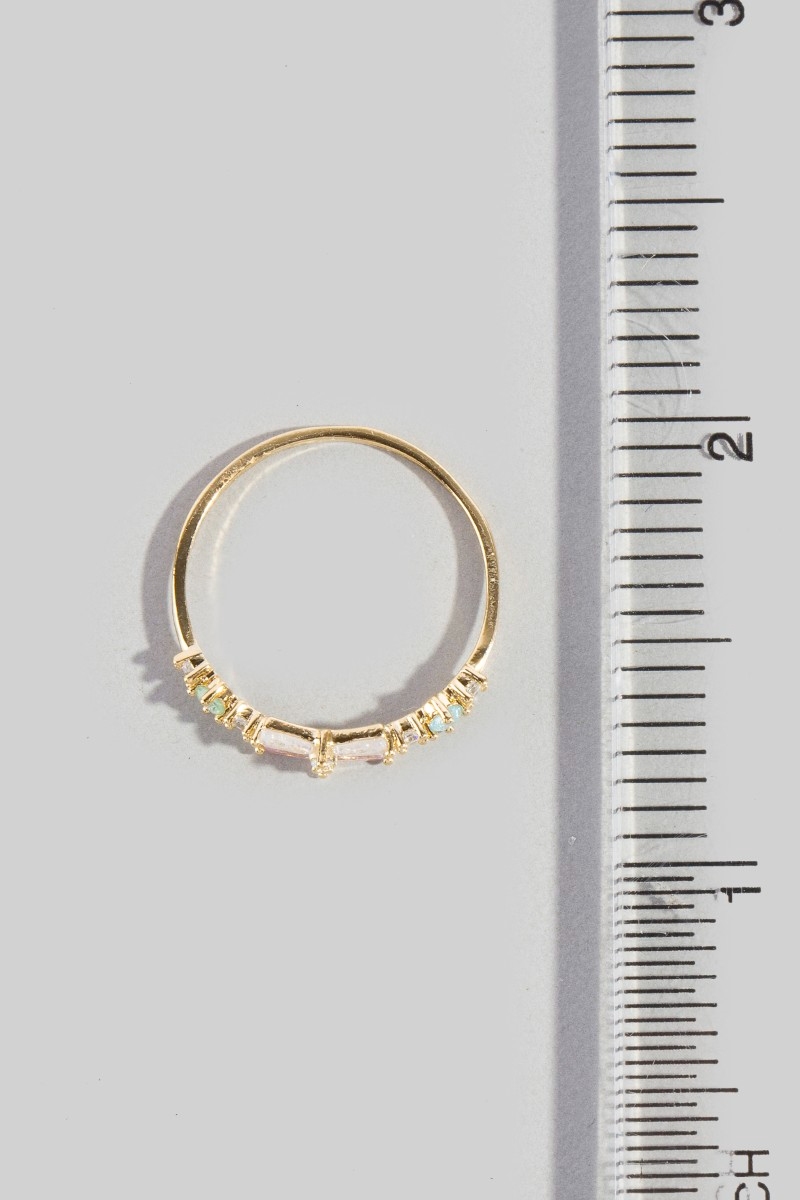 • This ring introduces a stunning gold dipped cubic zirconia baguette bow band style. Elevate your ensemble with this chic, timeless ring.