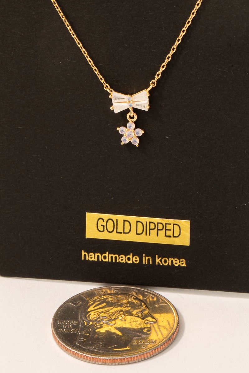 • This necklace brings a stunning gold dipped cubic zirconia bow tie and flower pendant style. Discover the perfect balance of functionality and fashion.