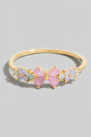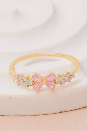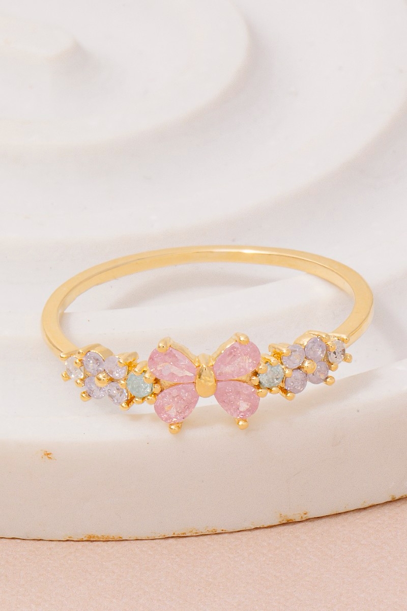 • This ring brings a stunning gold dipped cubic zirconia flower bow ribbon style. Savor the craftsmanship that goes beyond the ordinary, as this ring effortlessly captivates attention.