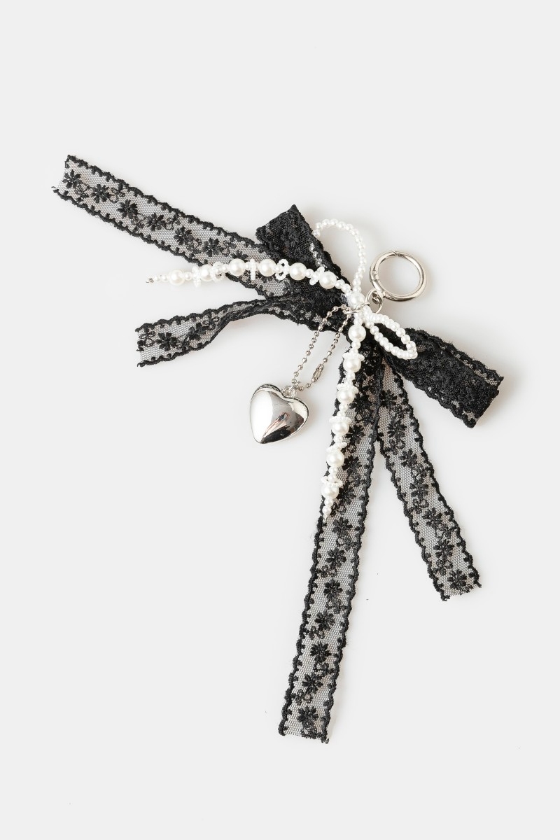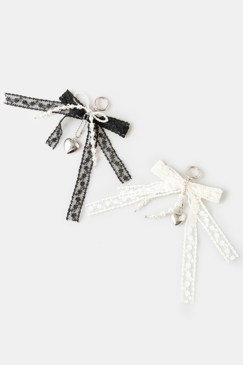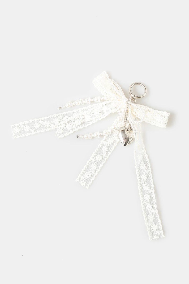 - This bag charm displays a vibrant pearl and floral lace ribbon bow s style. Discover the perfect balance of subtlety and flair as this bag charm effortlessly completes your look.