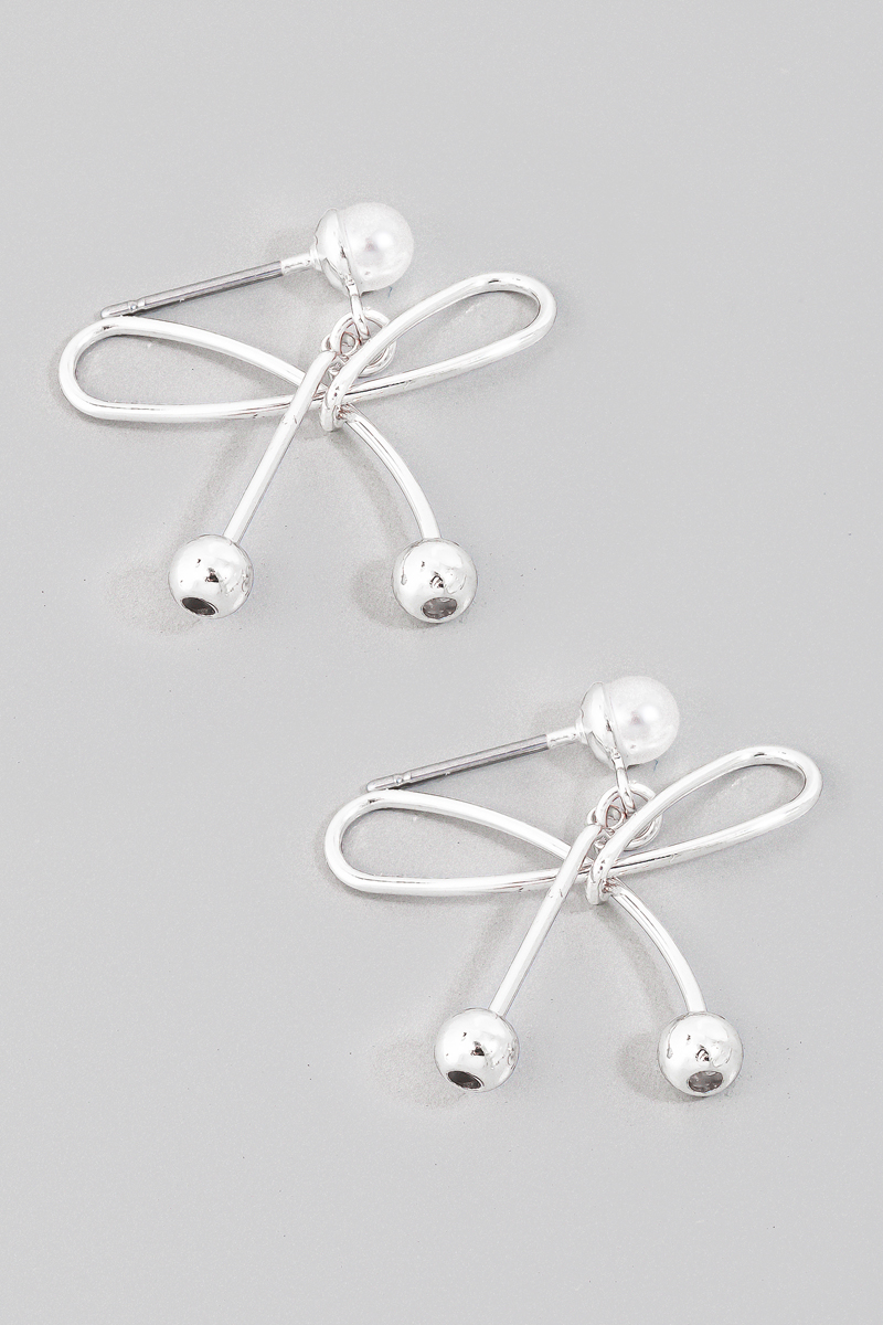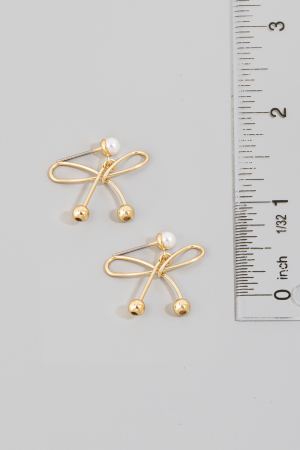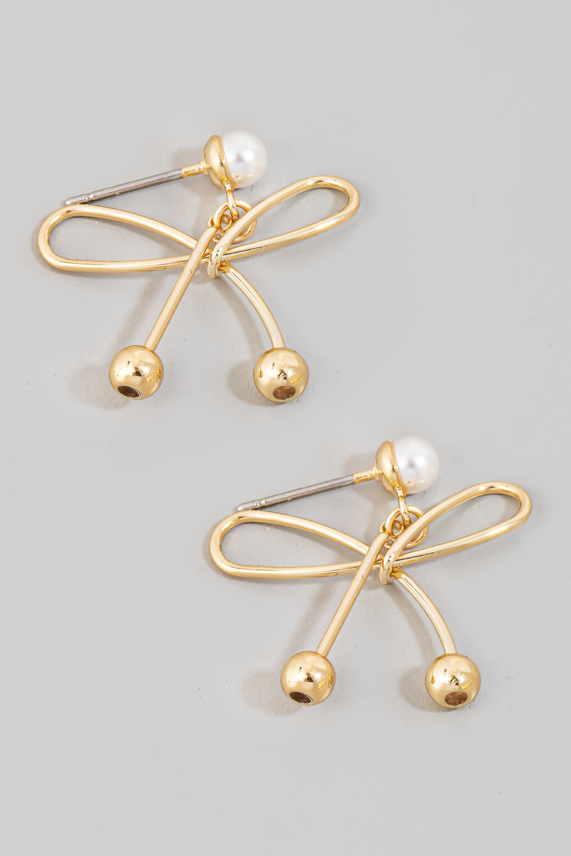 - This pair of dangle earrings brings a luxurious pearl stud metallic ribbon bow charm style. Experience refined sophistication with this understated yet stylish piece.