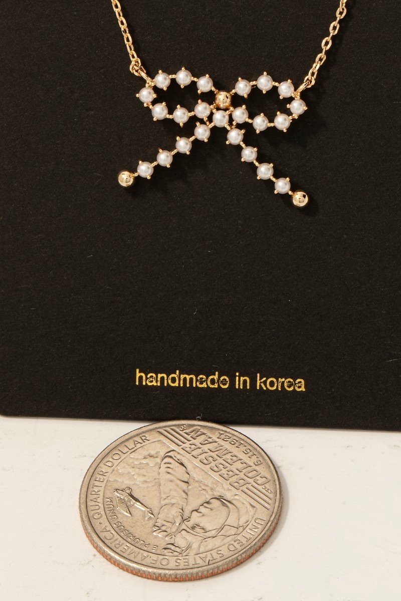 - This necklace displays a fashionable pearl studded bow pendant style. Savor the craftsmanship that goes beyond the ordinary, as this necklace effortlessly captivates attention.