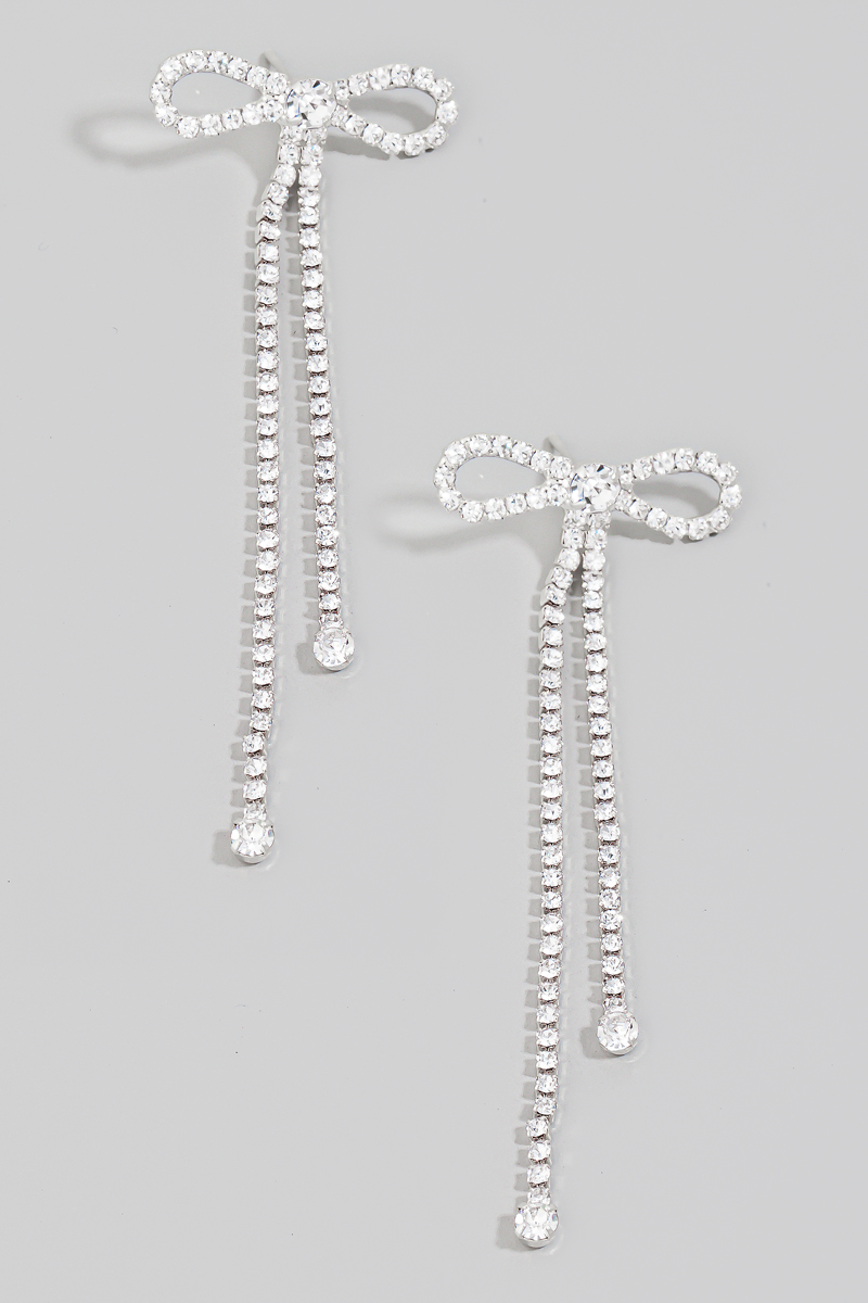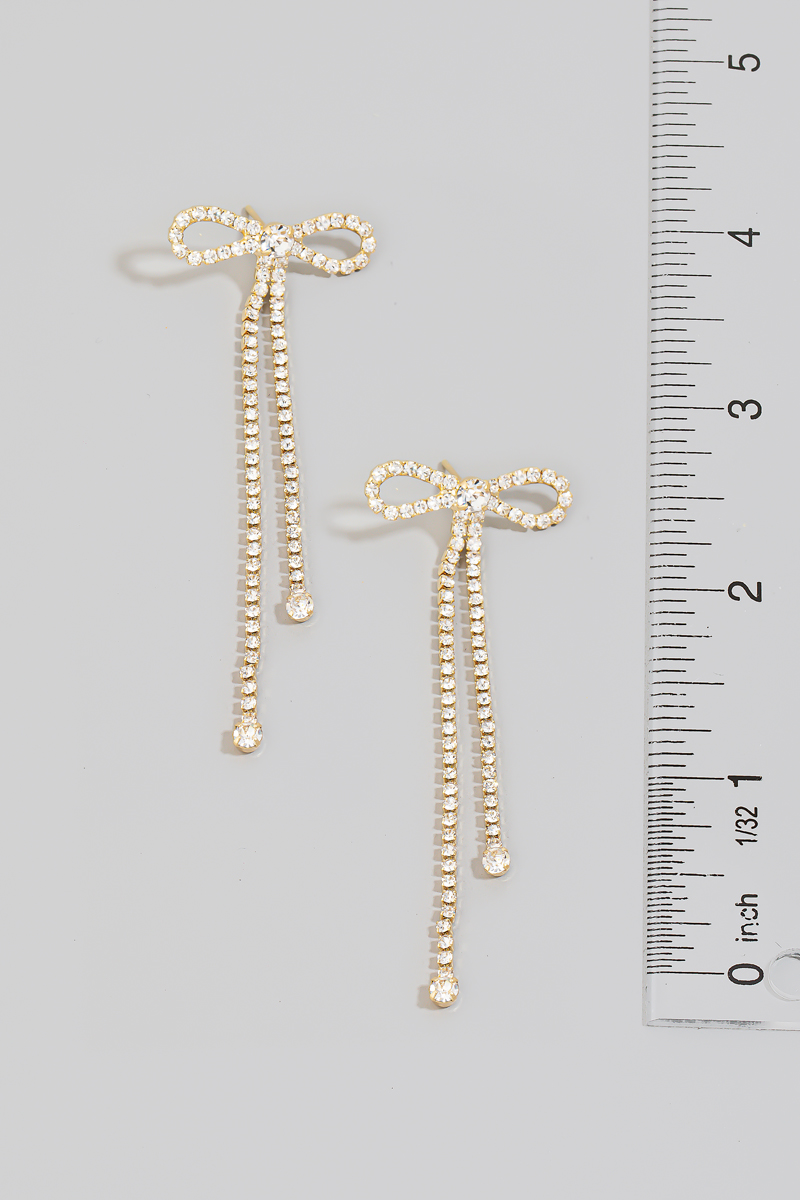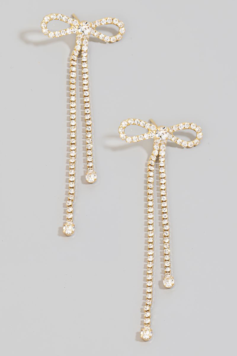• This pair of dangle earrings introduces a unique rhinestone bow tie stud style. Delight in the intricate details that make this accessory an essential element in expressing your fashion identity.