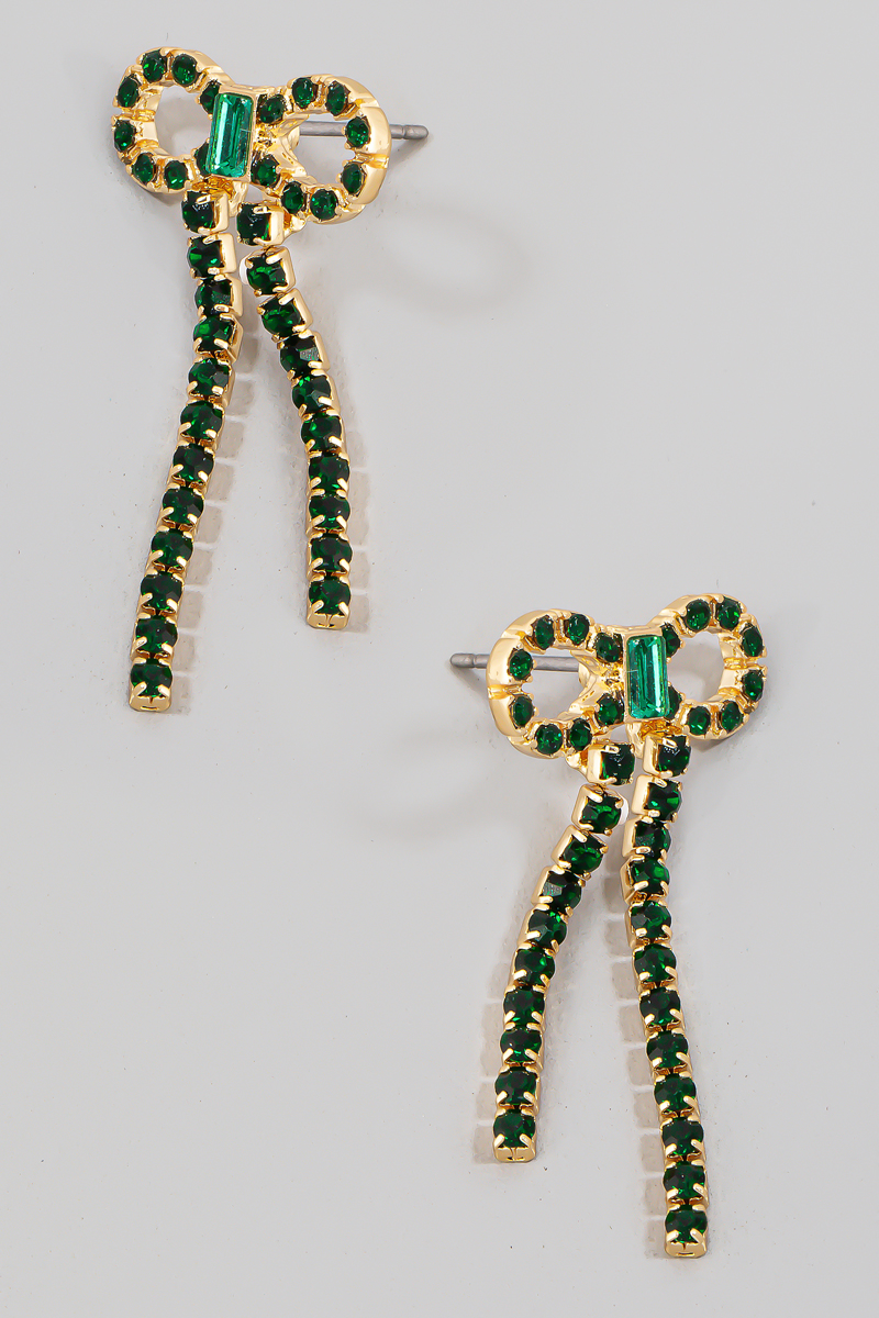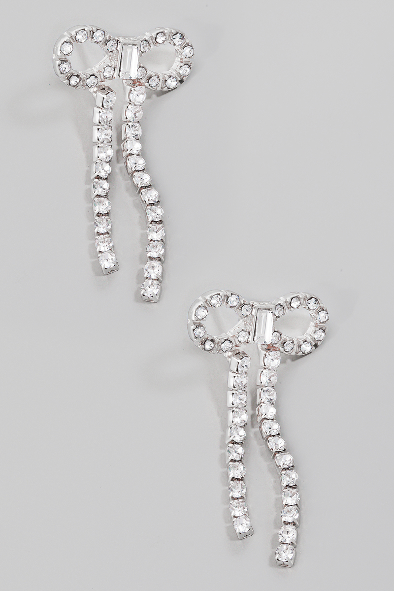 • This pair of stud earrings showcases a timeless rhinestone encrusted ribbon bow style. Delight in the nuanced details that make this accessory a testament to fine design and impeccable taste.