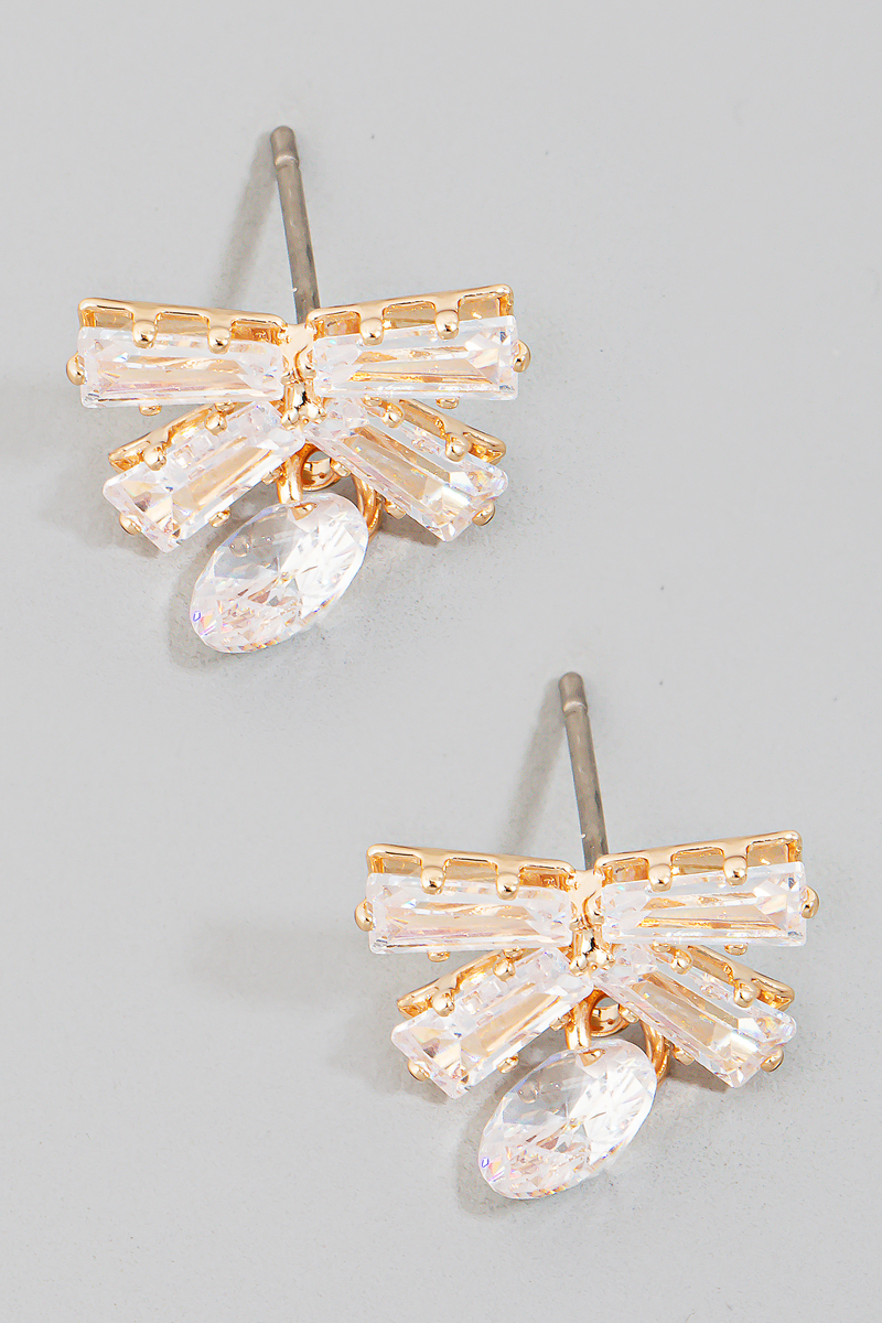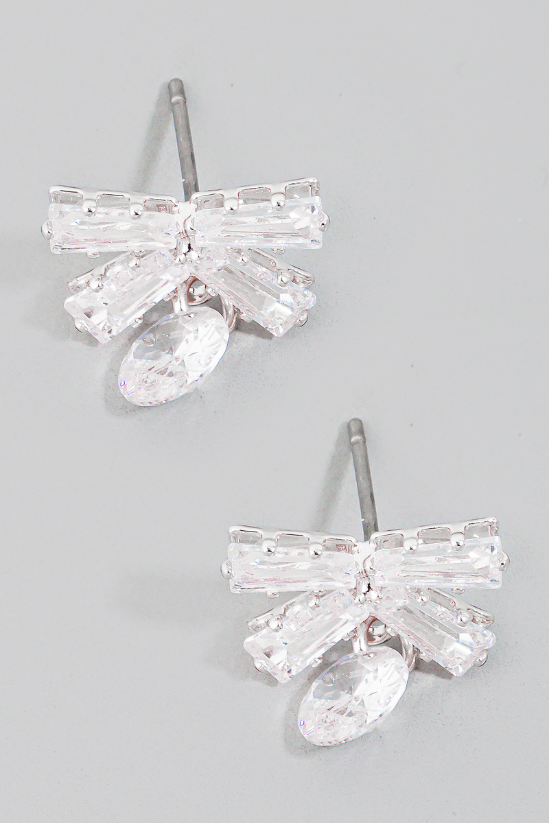• This pair of stud earrings introduces a stunning rhinestone ribbon bow and charm style. Immerse yourself in fashion finesse with this statement accessory.