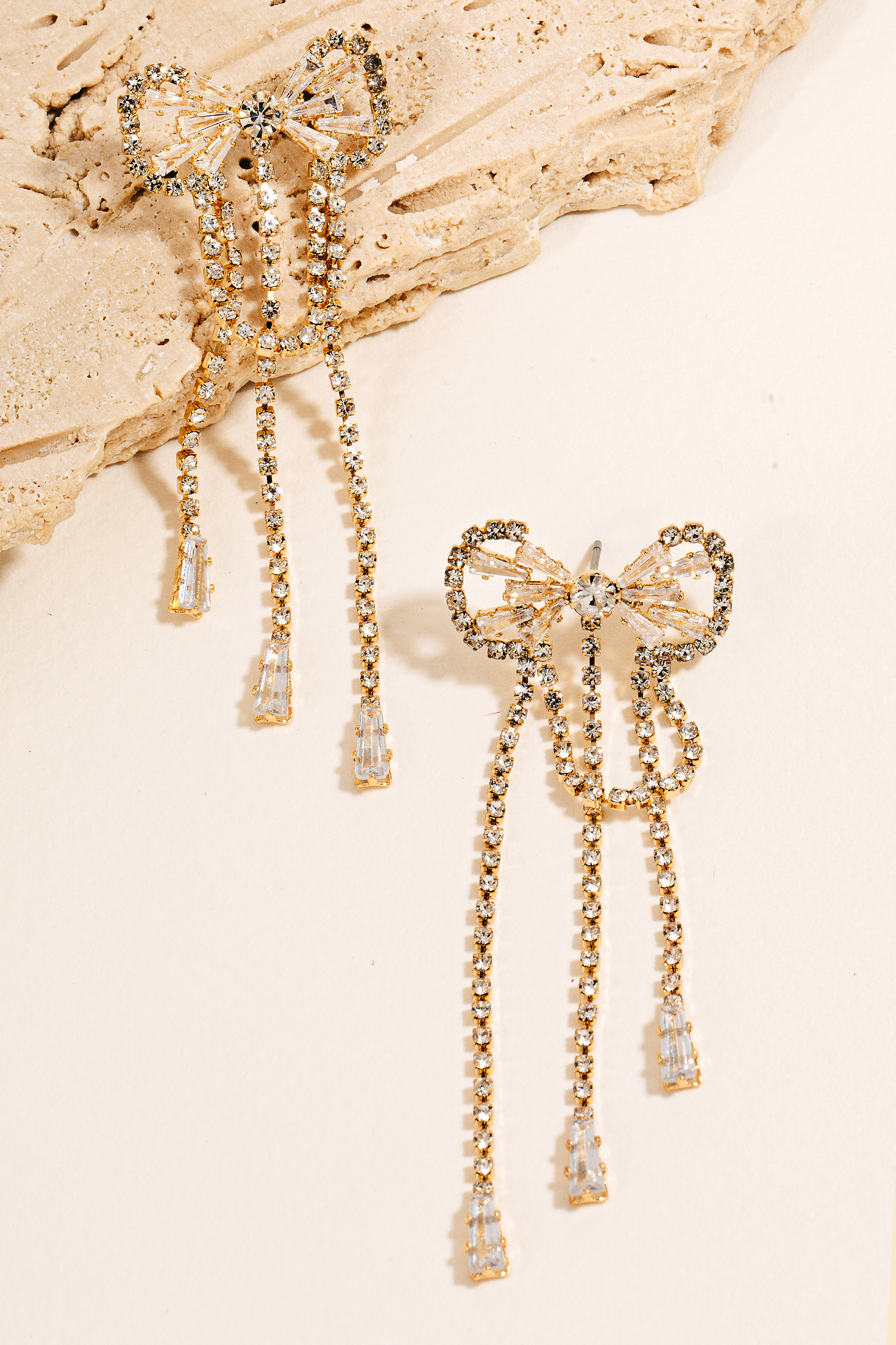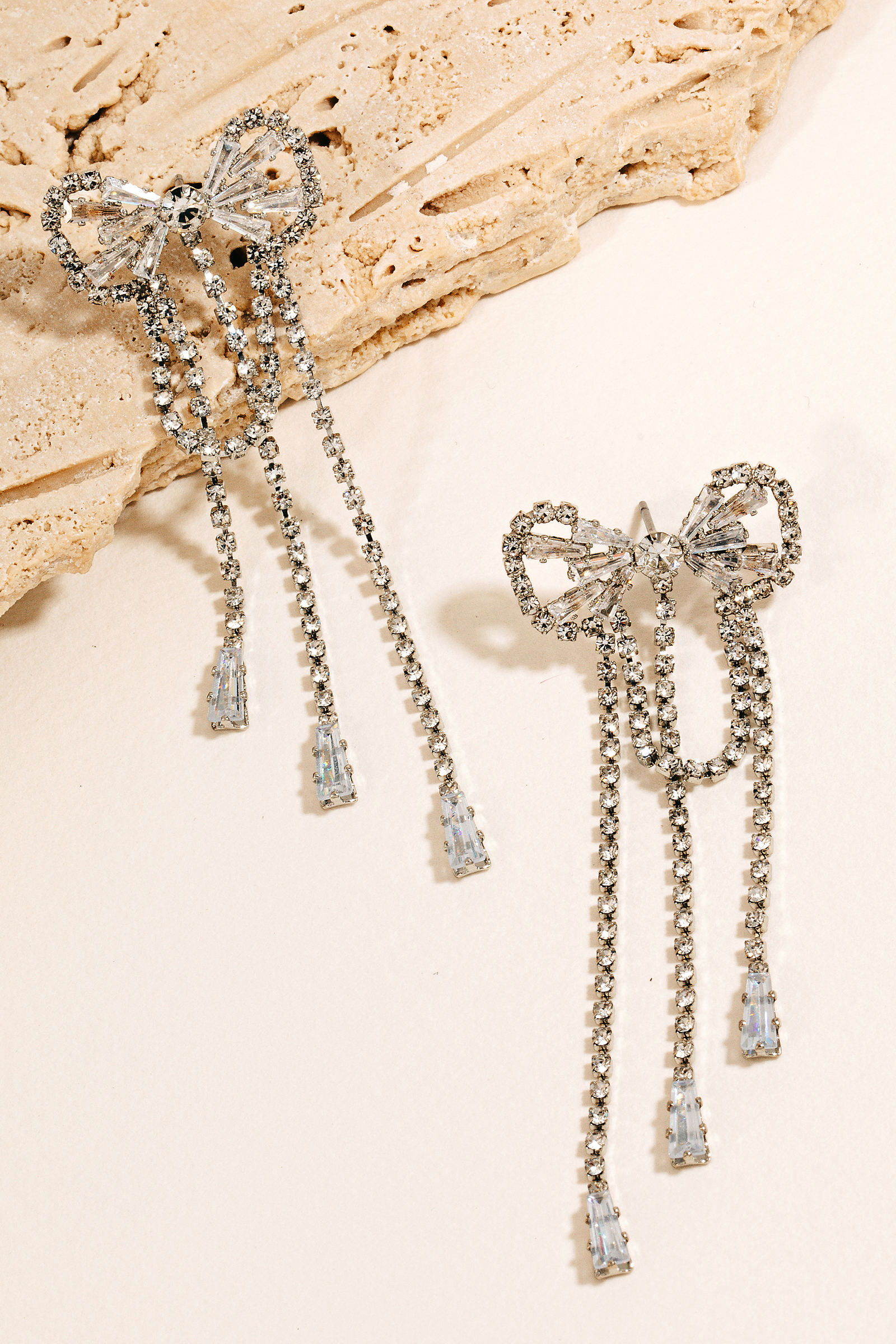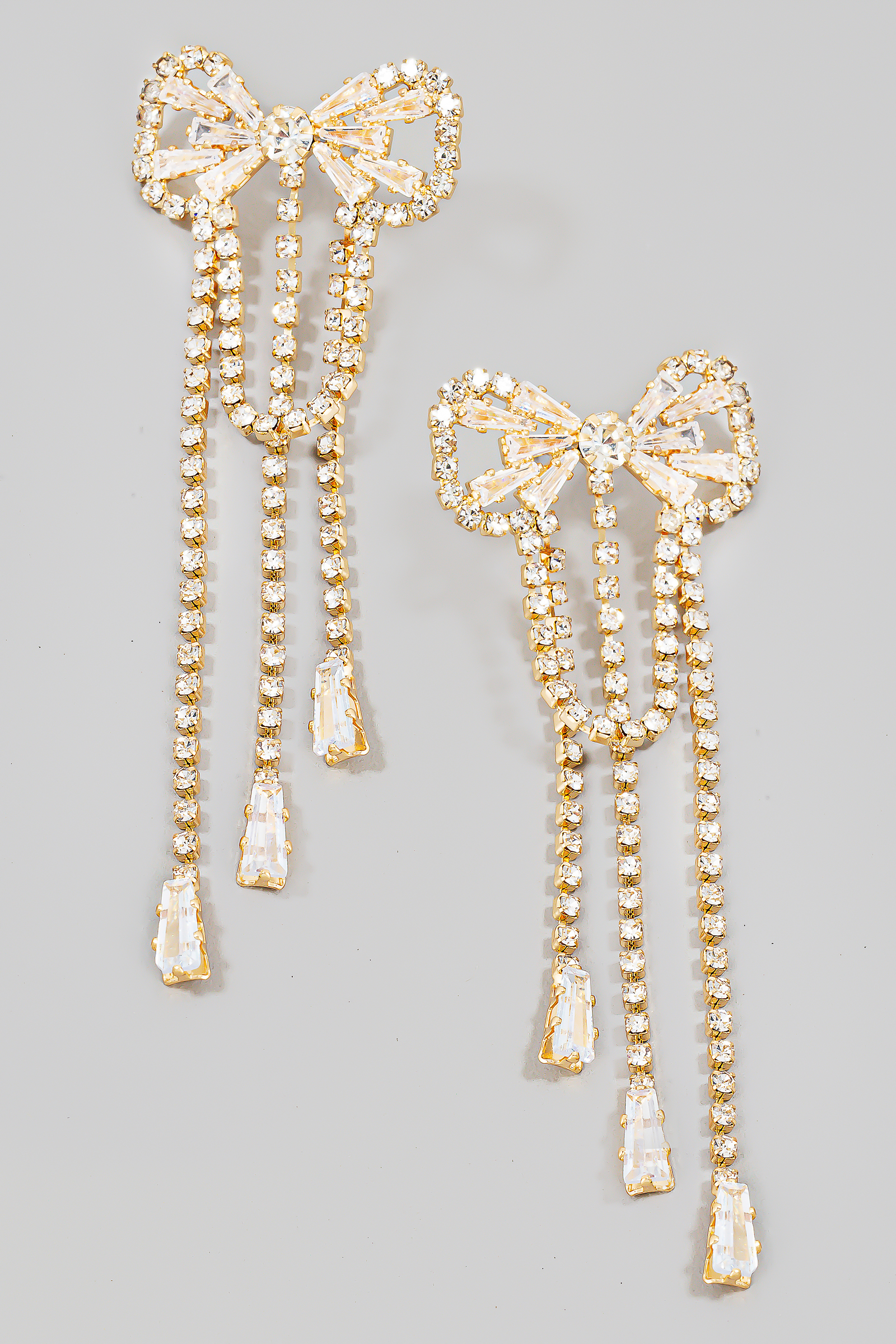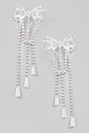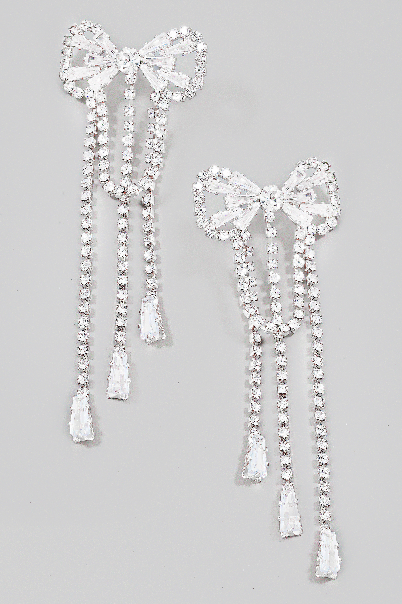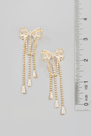 - This pair of dangle earrings displays a vibrant rhinestone ribbon bow stud style. Immerse yourself in the world of understated glamour as this accessory effortlessly exudes timeless appeal.