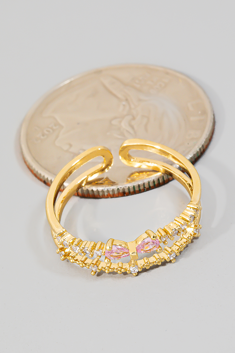 • This ring brings a unique two row rhinestone bow style. Discover the perfect balance of subtlety and flair as this ring effortlessly completes your look.