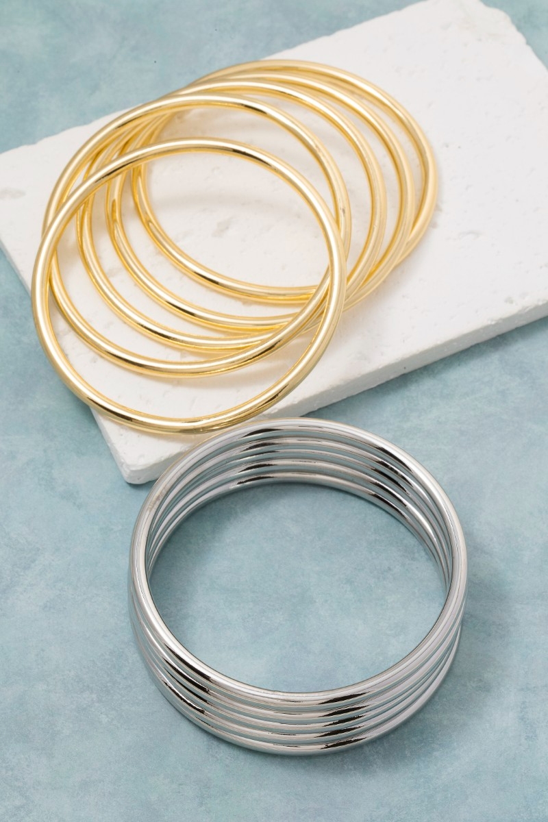 • This bangle bracelet displays a vibrant 5pc metallic set style. Experience a subtle blend of modernity and classic charm as this bangle bracelet effortlessly adorns your ensemble.