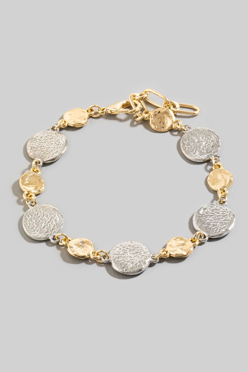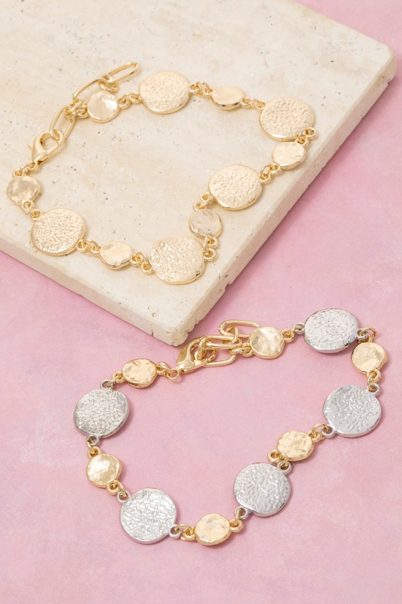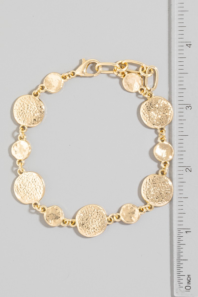 - This chain bracelet showcases a timeless metallic hammered coins style. Indulge in the artistry of accessorizing with this unique piece.