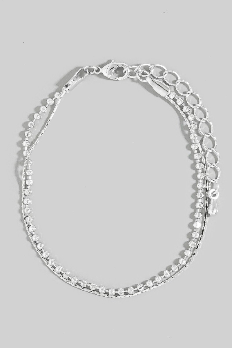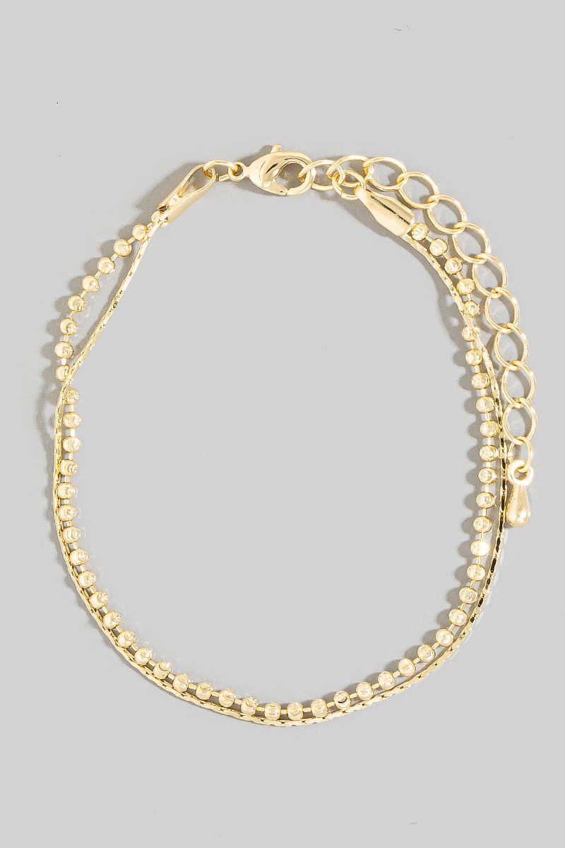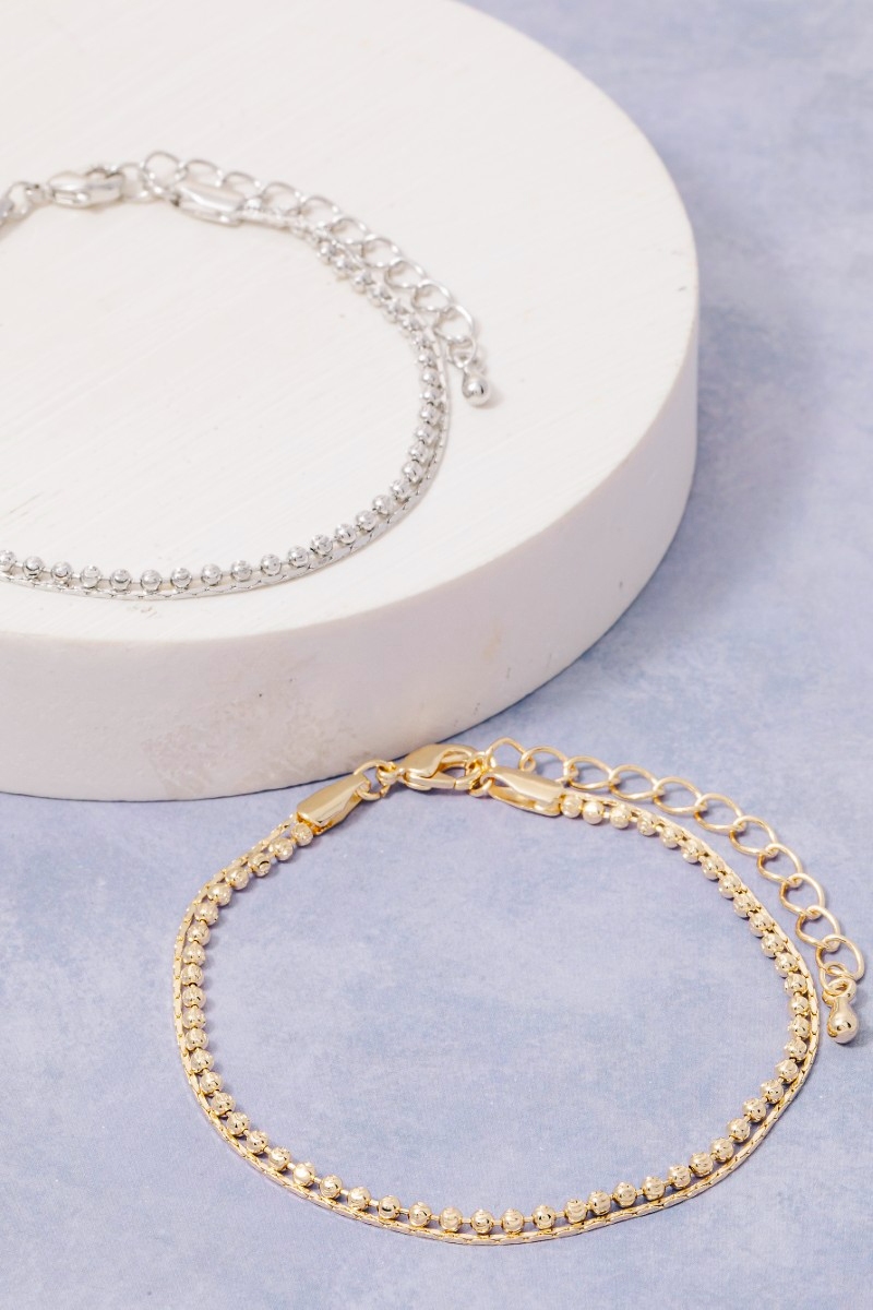 - This bracelet features a fashionable two row dainty metal chain bead style. Immerse yourself in the world of understated glamour as this bracelet effortlessly exudes timeless appeal.