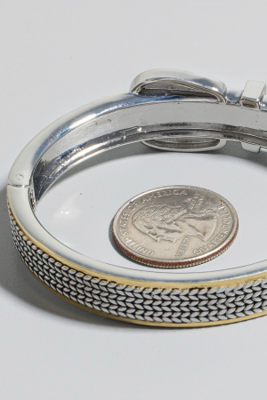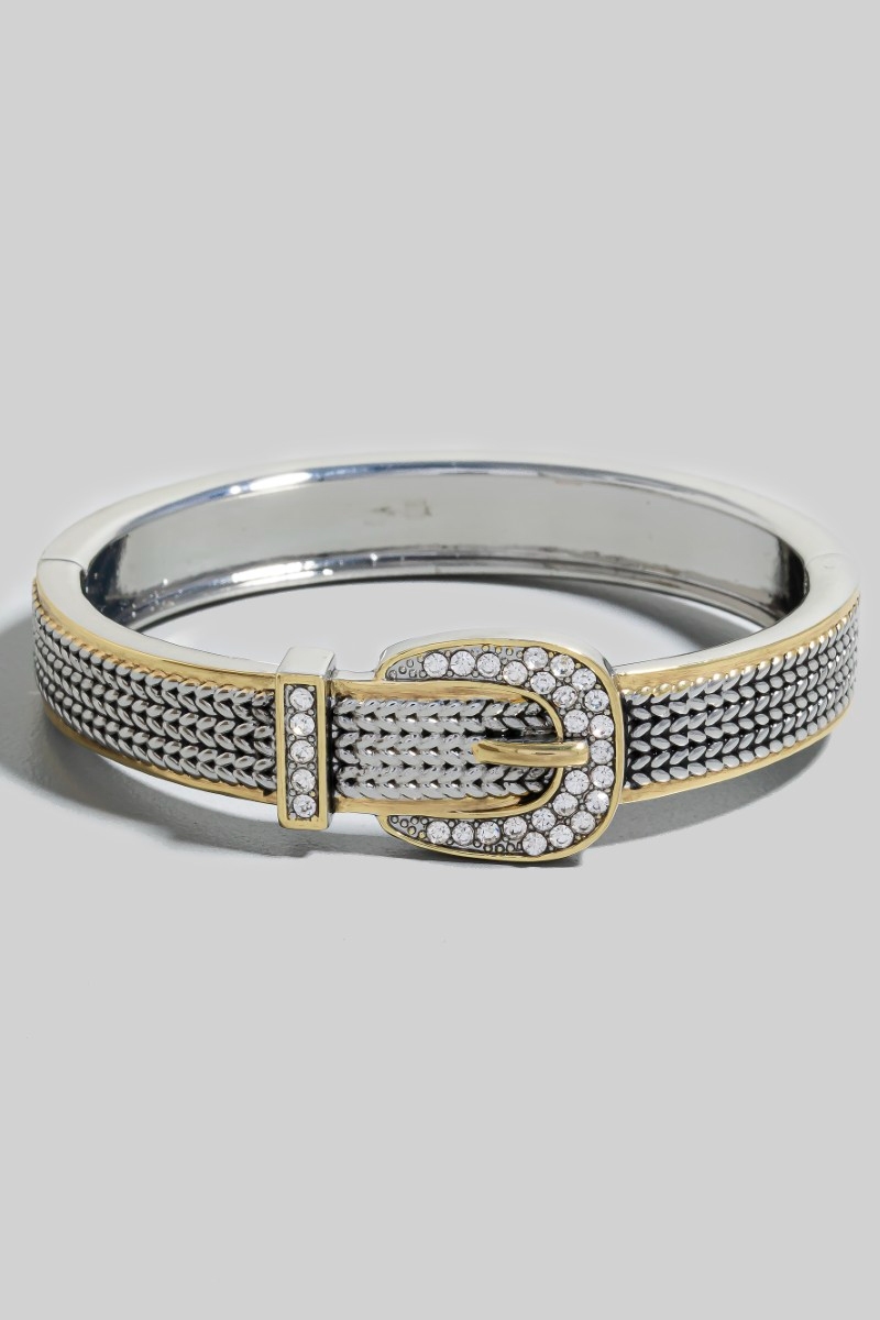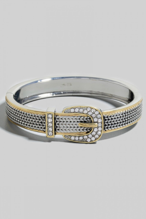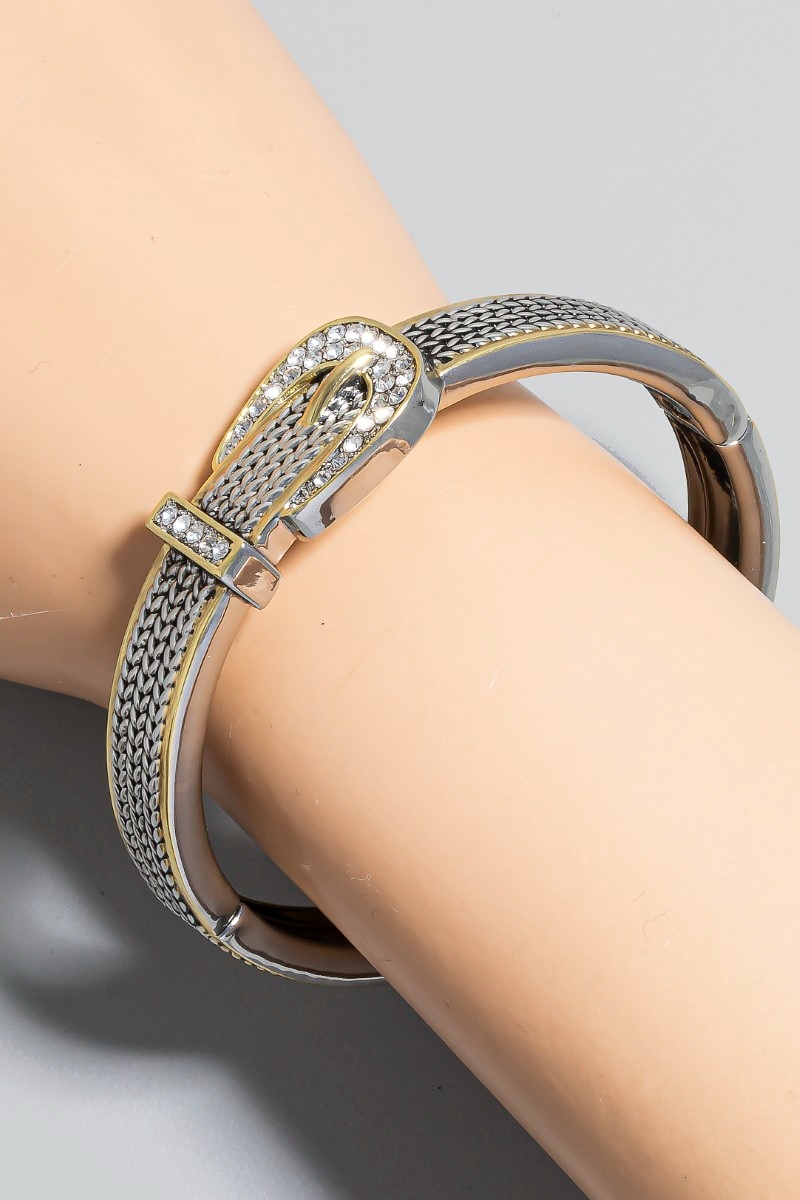- This bangle bracelet showcases a timeless gold dipped cubic zirconia studded belt hinge style. Experience the joy of accessorizing with this piece that effortlessly combines versatility and charm.
