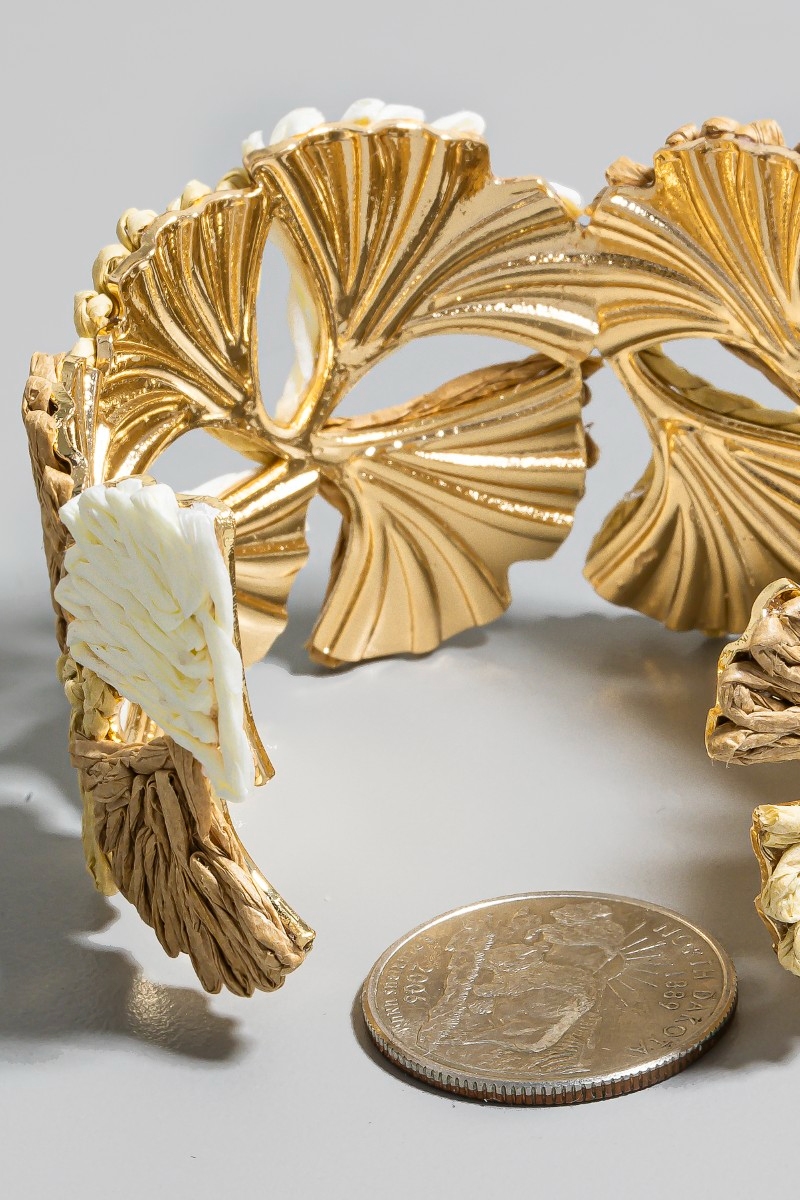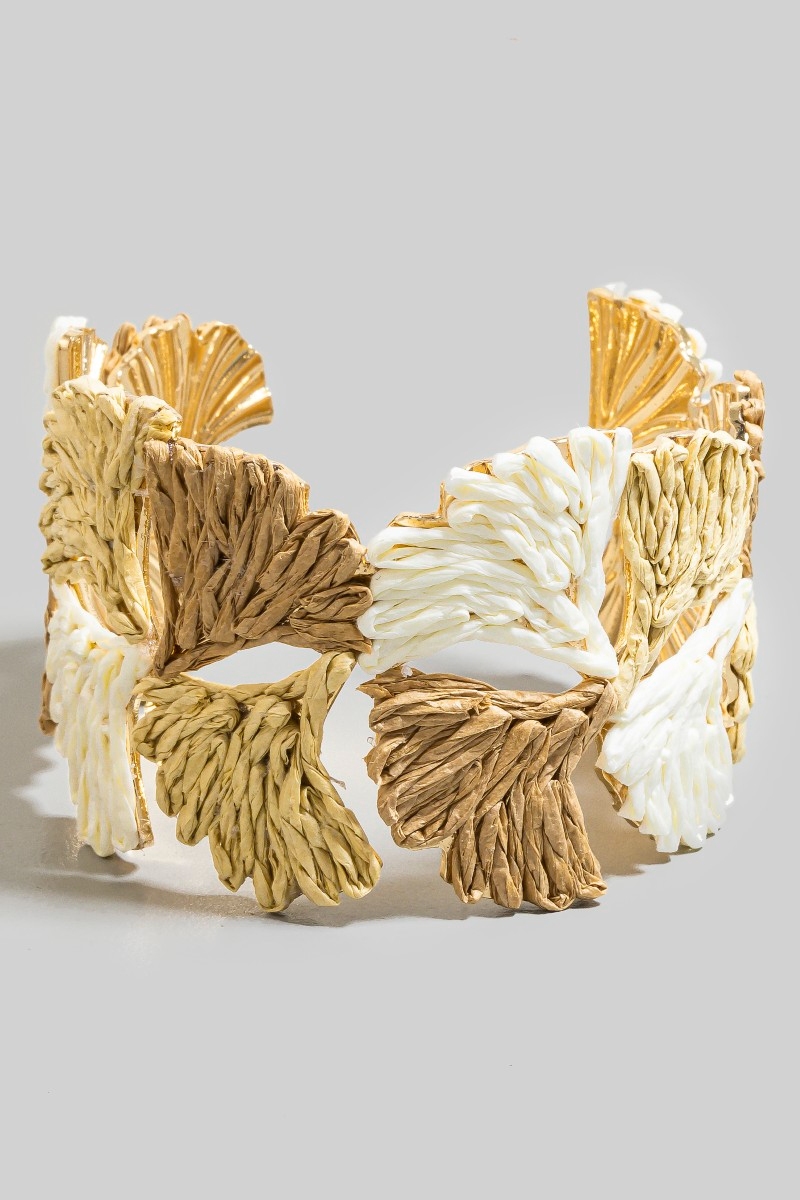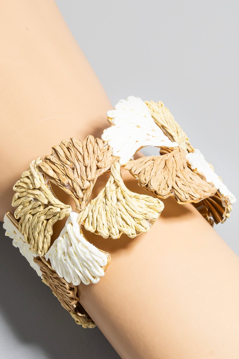 - This cuff bracelet displays a fashionable three tone raffia leaf style. Explore a blend of classic charm and contemporary flair.