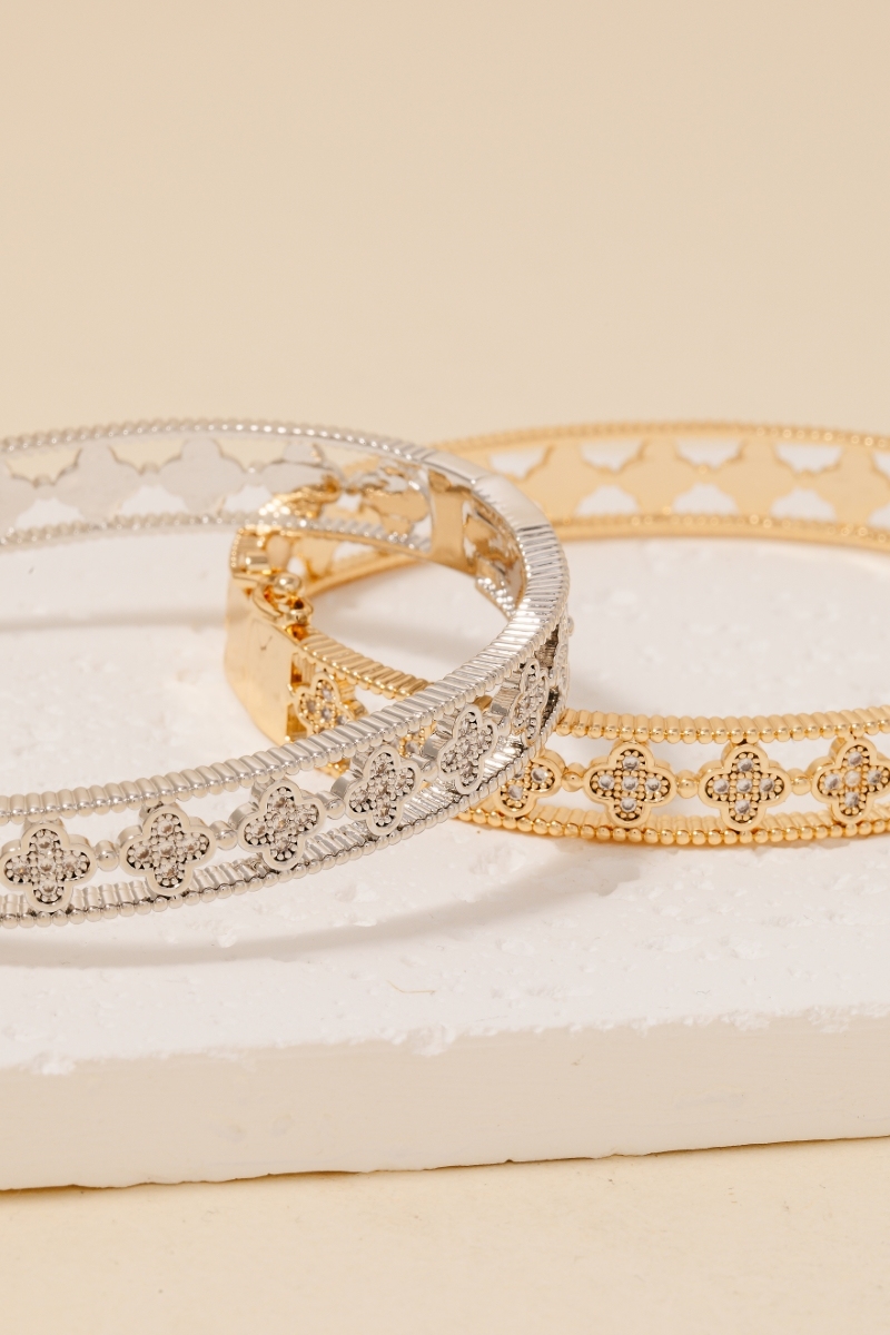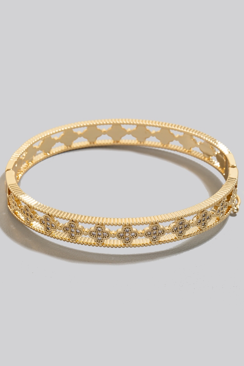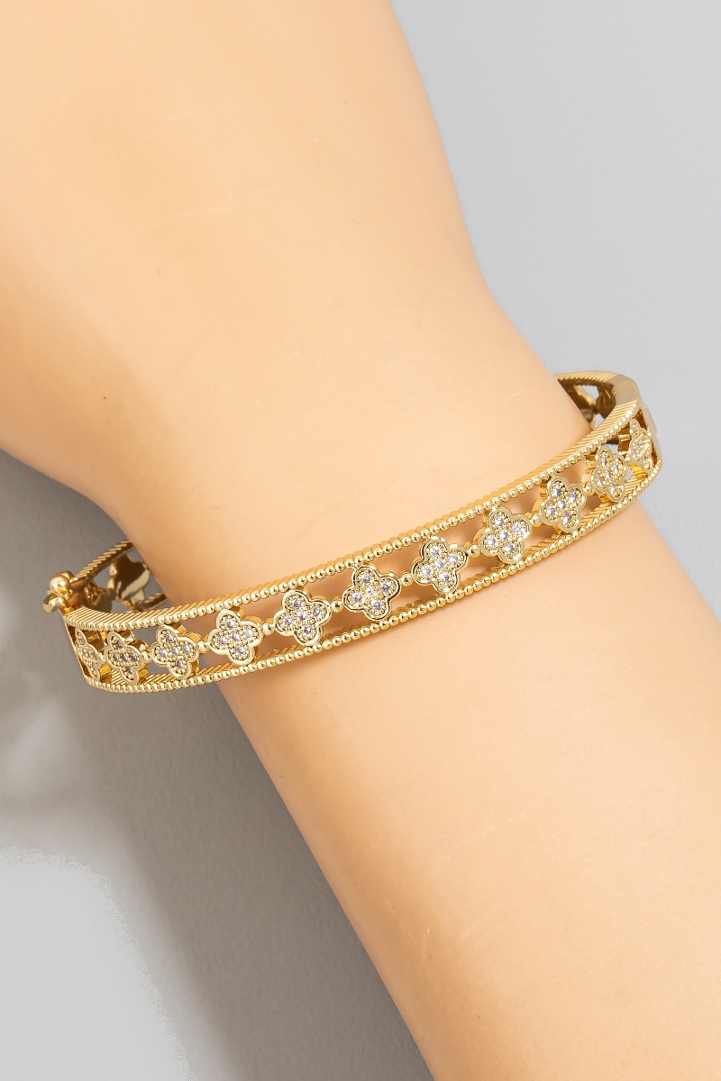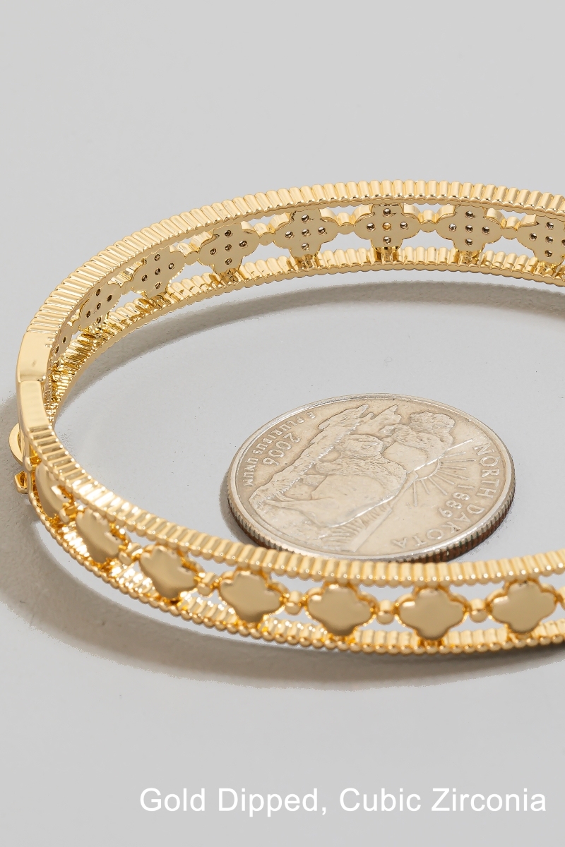 - This bangle bracelet introduces a unique gold dipped cubic zirconia pave clover row hinge style. Elevate your ensemble with this chic, timeless bangle bracelet.
