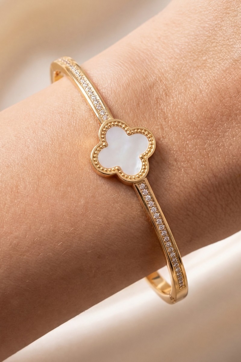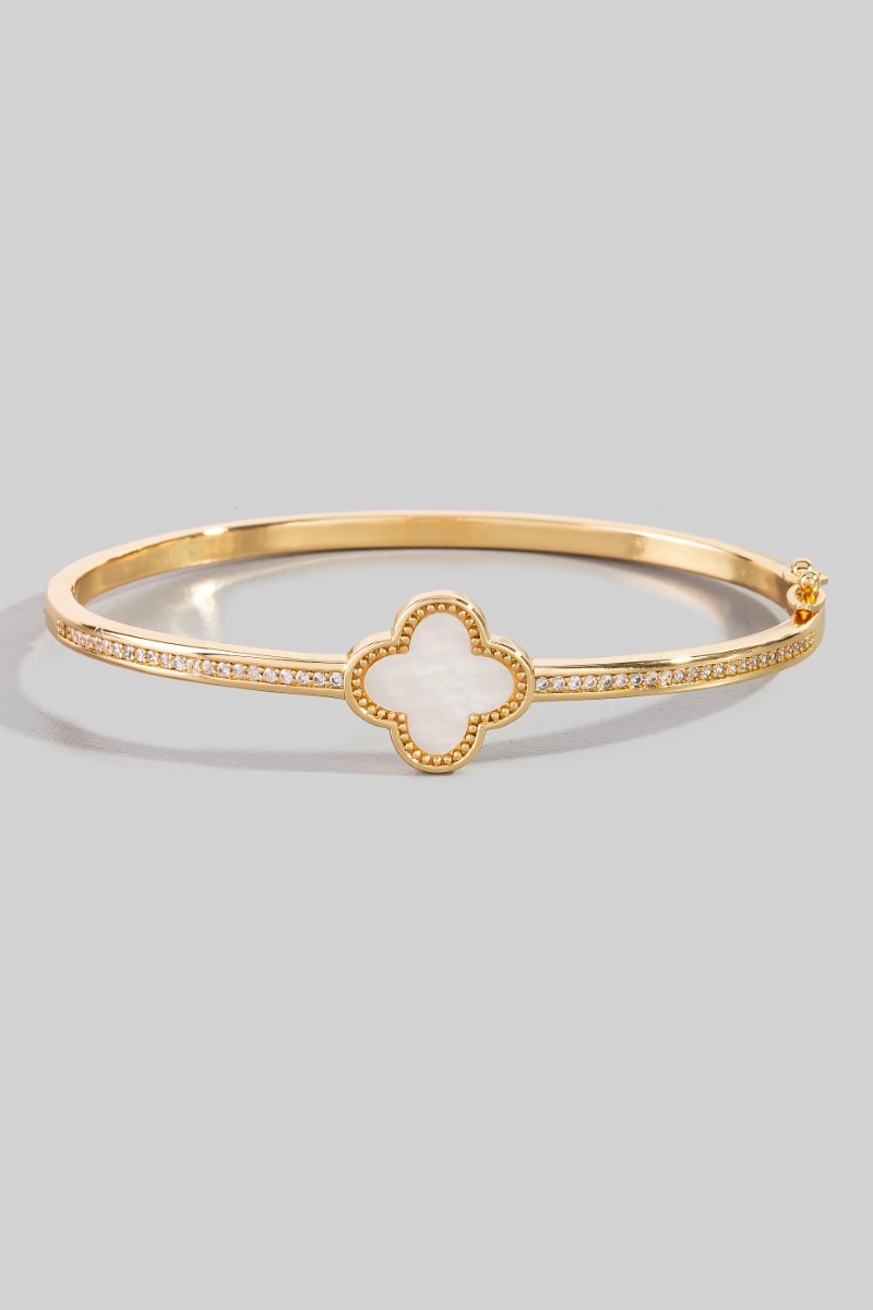 - This bangle bracelet introduces a unique gold dipped cubic zirconia mother of pearl clover hinge style. Celebrate individuality with this bangle bracelet that effortlessly expresses your unique sense of style.