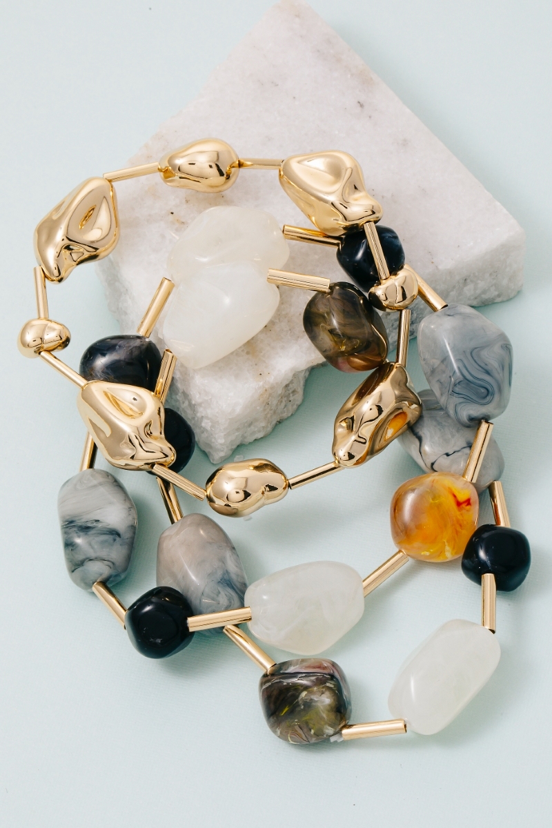 - This bracelet showcases a unique irregular metallic and acrylic beaded set style. Experience a burst of creativity in accessorizing as this piece effortlessly sets the tone for your unique style.