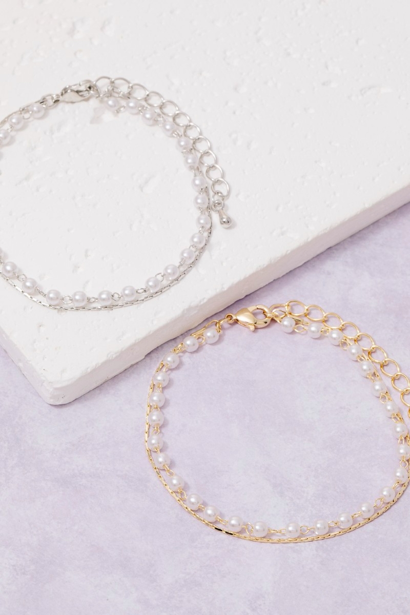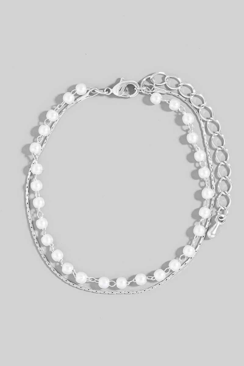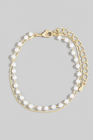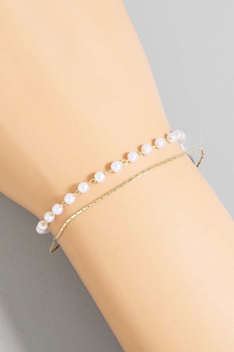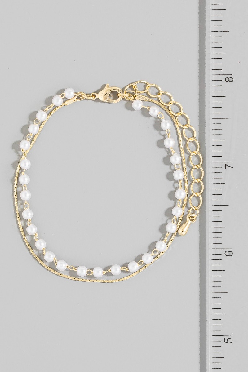 - This bracelet showcases a unique layered chain with pearl beads style. Indulge in the artistry of accessorizing with this unique piece.