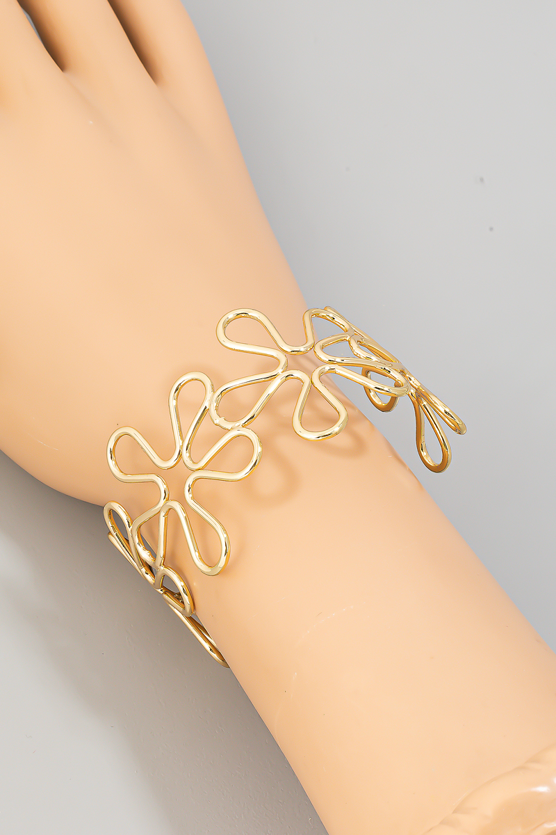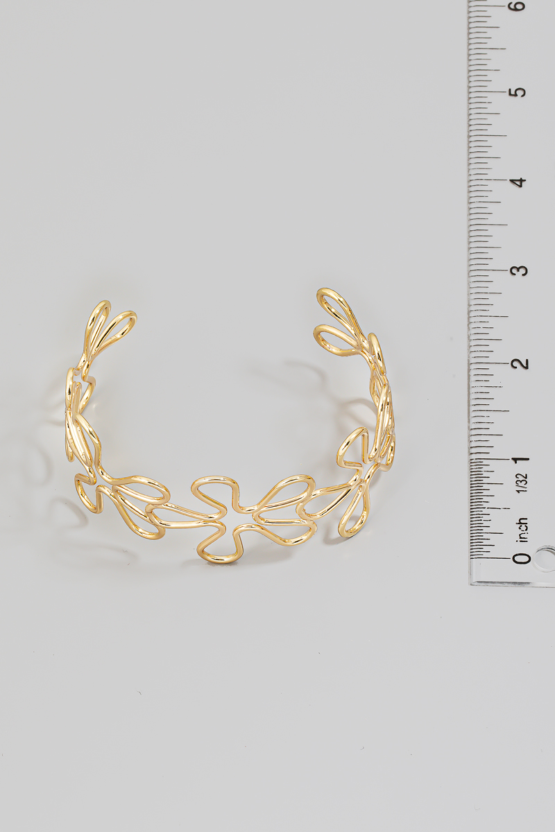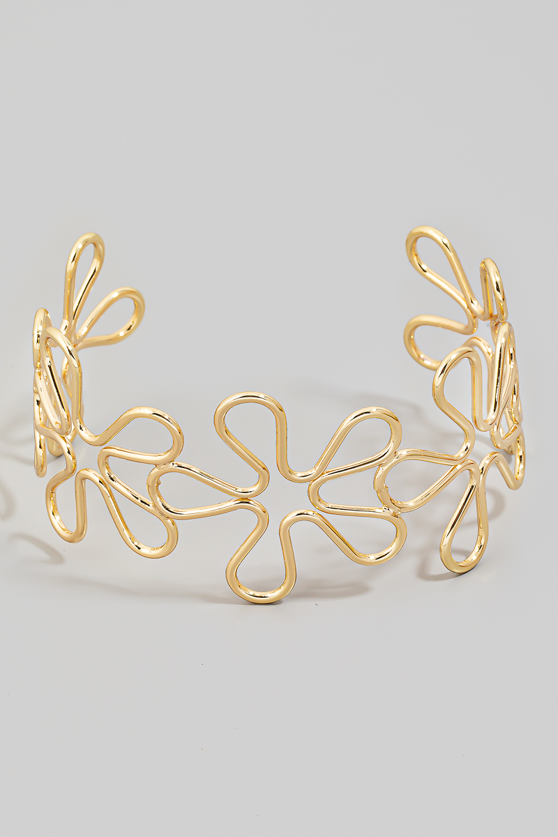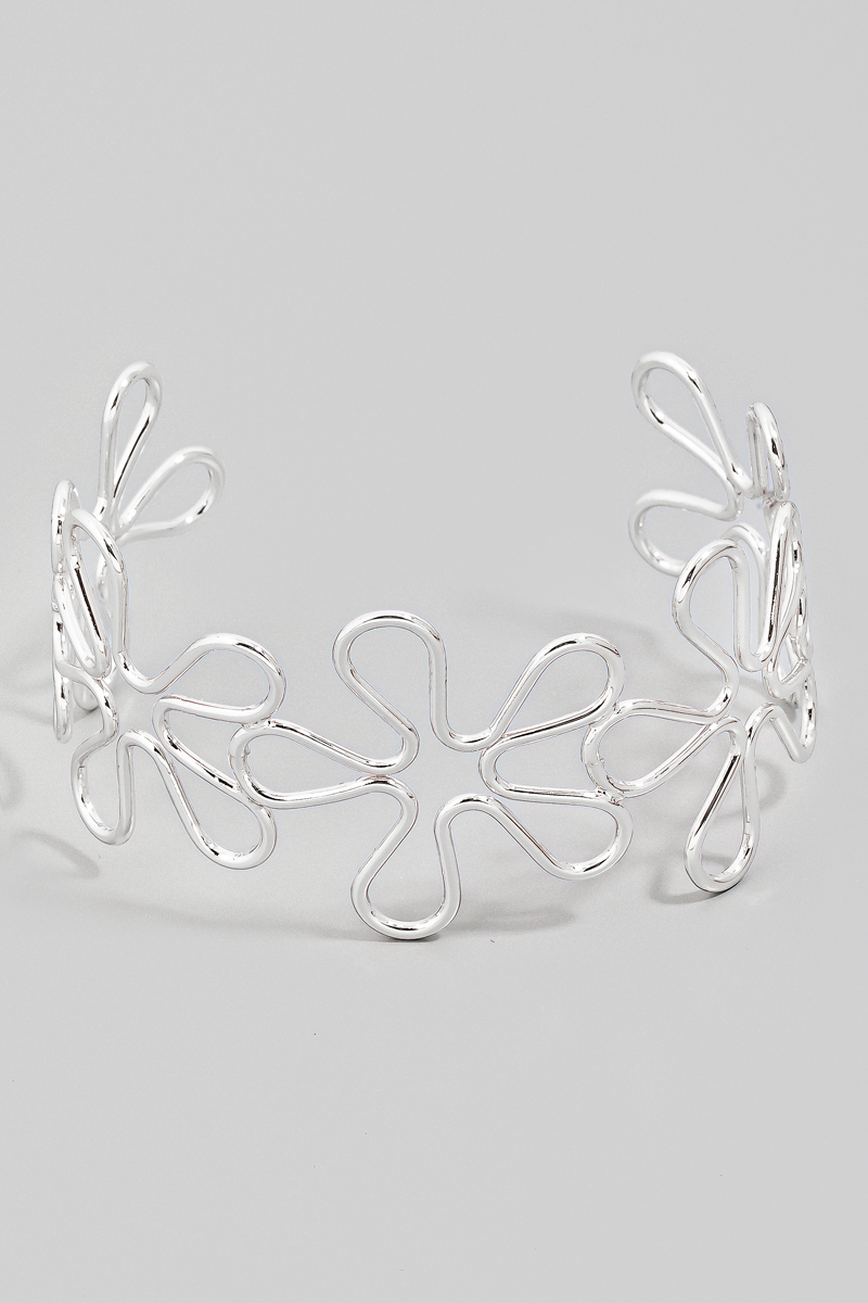 • This cuff bracelet brings a unique metallic wire flower style. Indulge in the artistry of accessorizing with this unique piece.