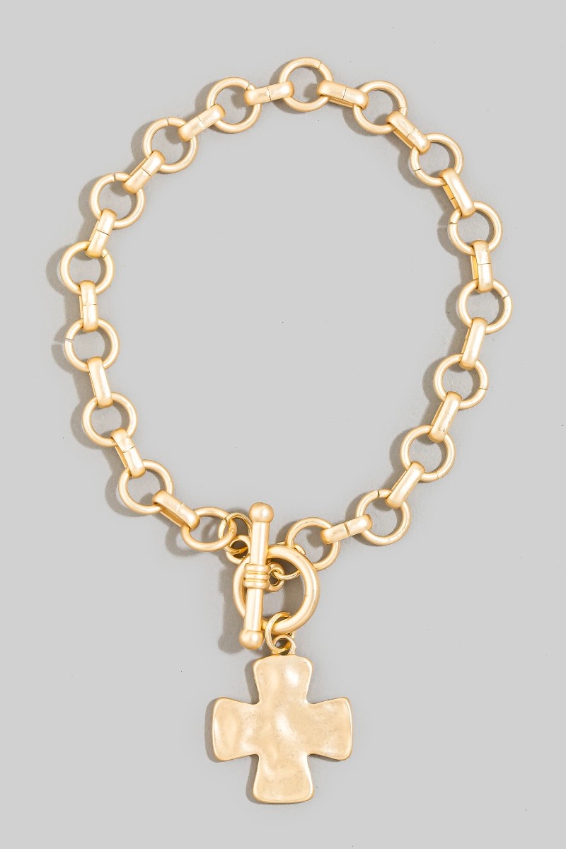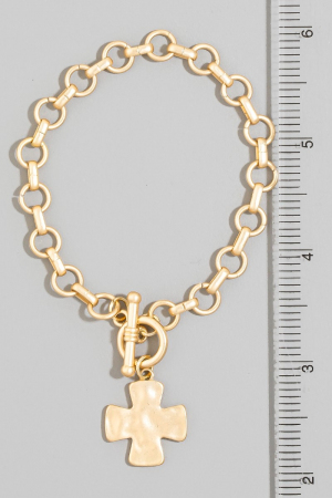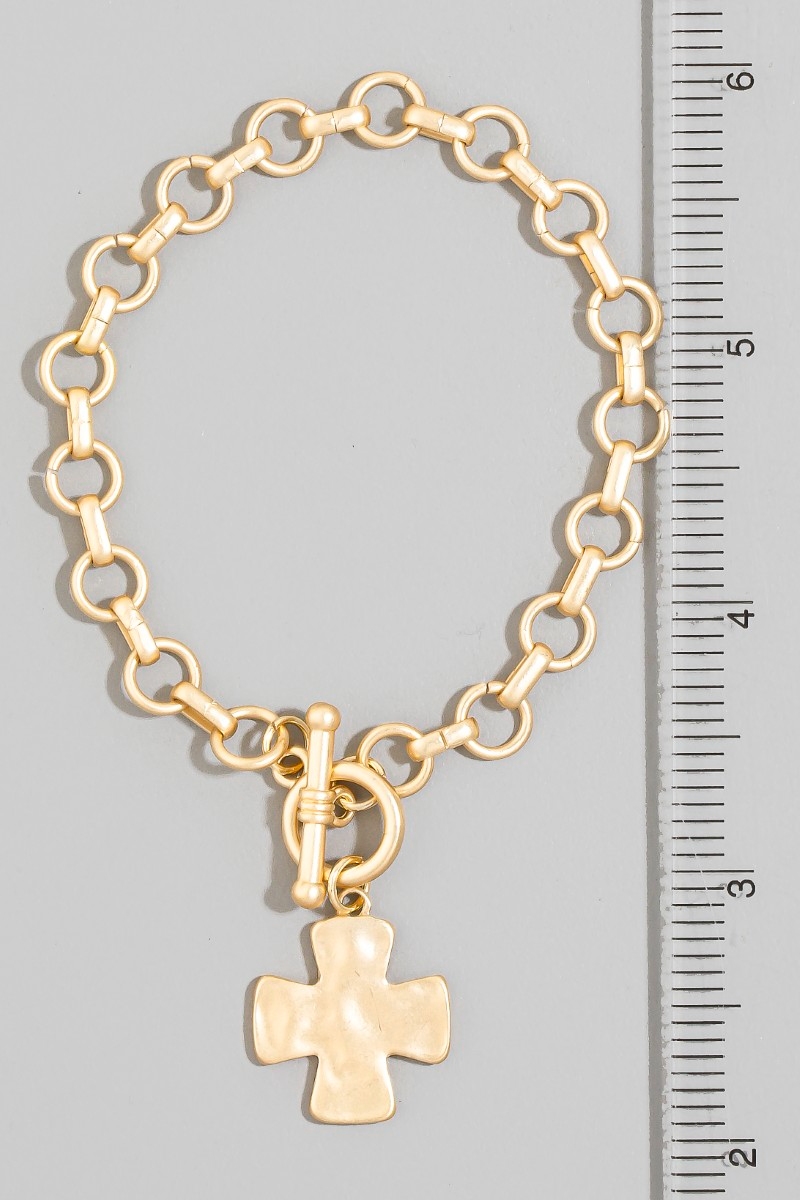 - This chain bracelet adds a modern matte metallic cross charm toggle style. Experience a subtle blend of modernity and classic charm as this chain bracelet effortlessly adorns your ensemble.