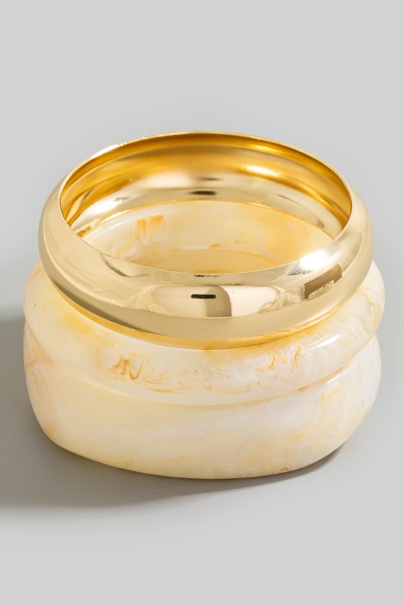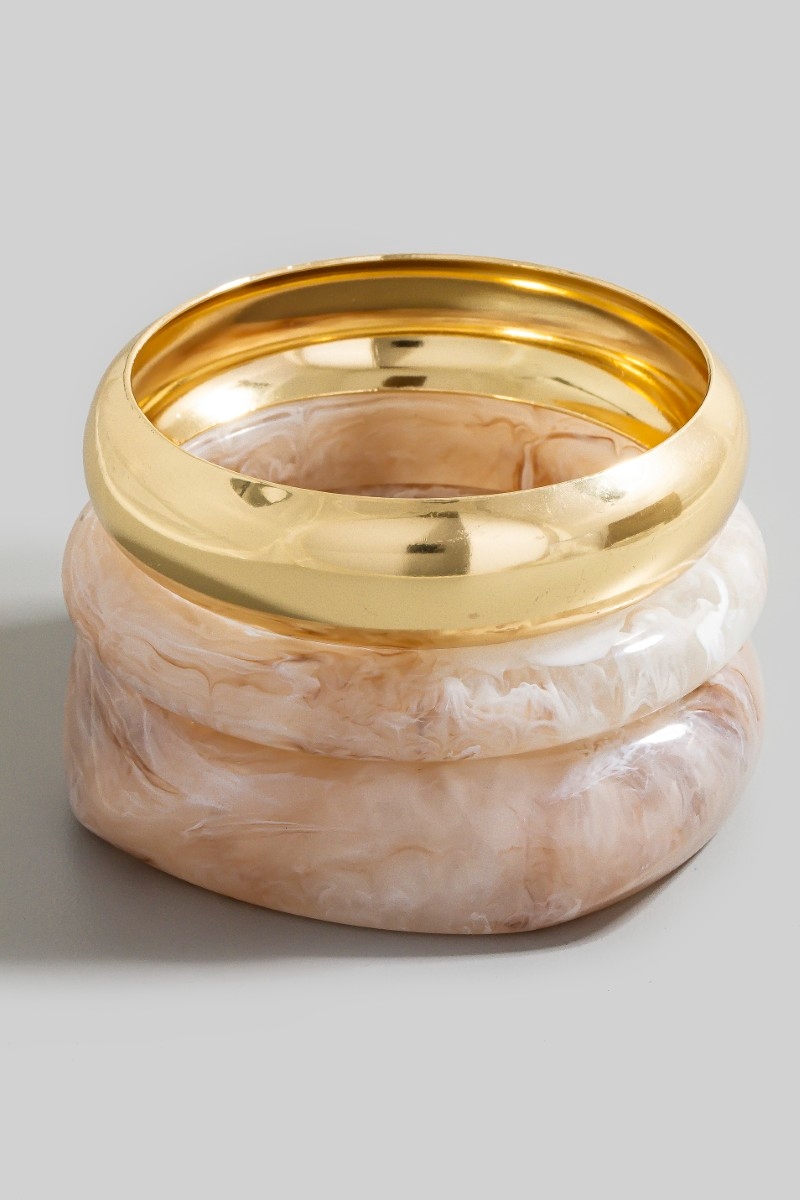 • This bangle bracelet brings a unique 3 piece metallic and marble resin set style. Experience refined sophistication with this understated yet stylish piece.