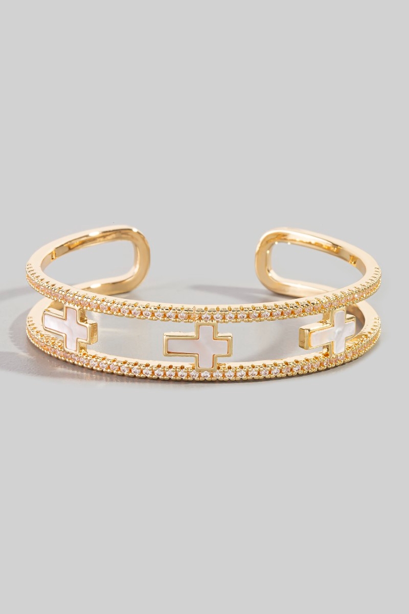 • This cuff bracelet adds a modern pave double row cross style. Celebrate the art of accessorizing with this piece that effortlessly encapsulates modern trends.