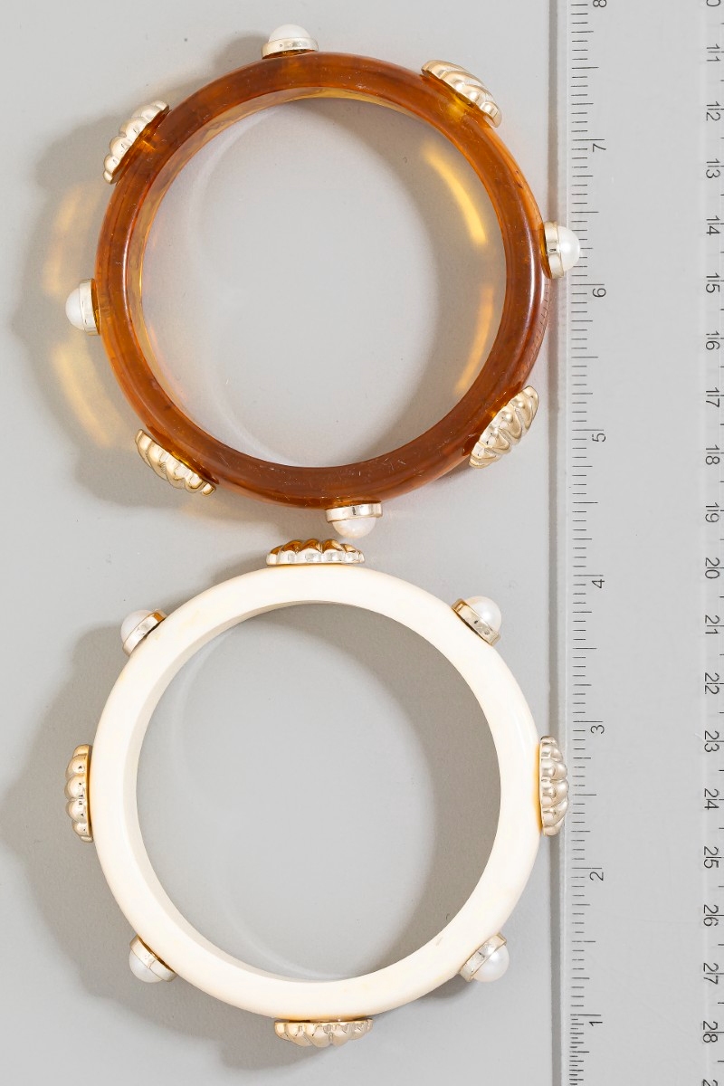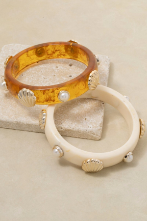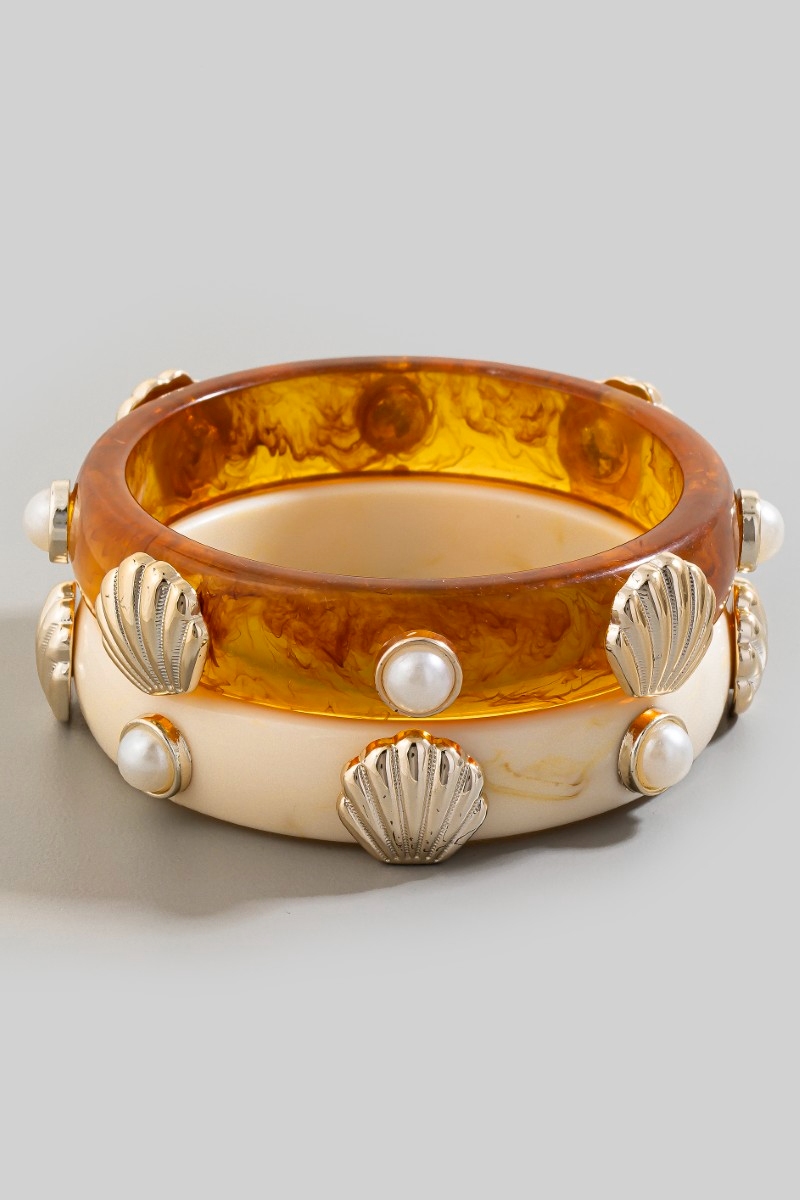 - This bangle bracelet adds a modern pearl and clam shell stud marble resin set style. Experience a burst of creativity in accessorizing as this piece effortlessly sets the tone for your unique style.