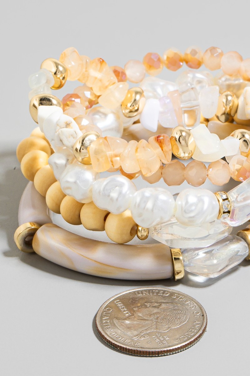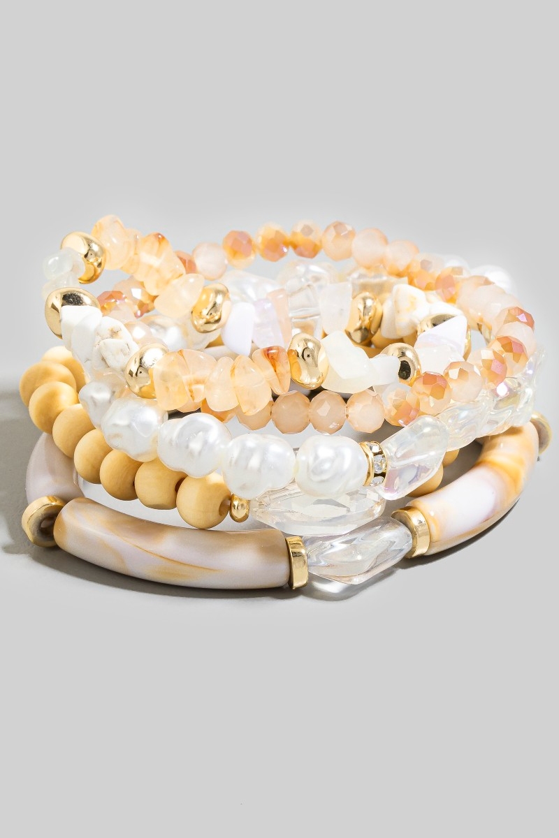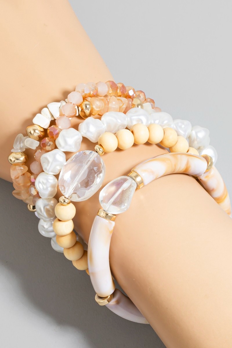 - This bracelet displays a fashionable pearl stone and wood beaded set style. Delight in the intricate details that make this bracelet an essential element in expressing your fashion identity.